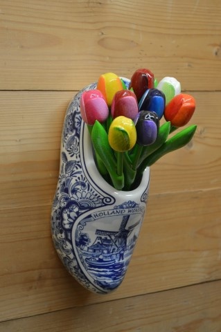 Het boeket houten tulpen in een handbeschilderde Delfts blauwe muurklomp is een prachtig staaltje ambachtswerk. De tulpen zijn met de hand vervaardigd en beschilderd met olieverf in sprekende kleuren, waardoor ze nooit verwelken en jarenlang mooi blijven.