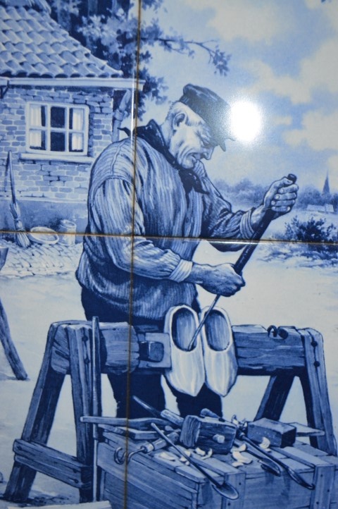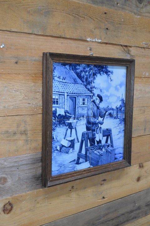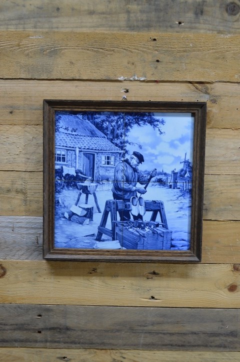 Het tafereel toont een klompenmaker die een paar klompen snijdt, met zijn hakblok achter zich. Hij staat voor zijn huisje met half rieten kap onder een grote boom. De waterpomp van de familie en de windmolen van de stad staan op de achtergrond.