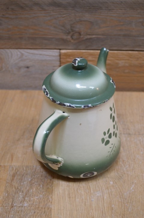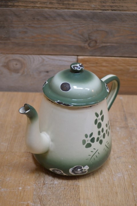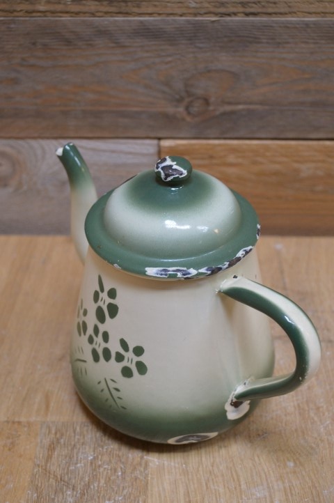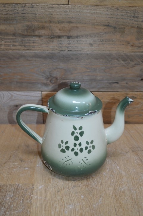 Brocante metalen schenkkannetje dat donkergroen op roomkleurige basis geëmailleerd is. Een retro koffiepot met een Frans design uit de jaren 50.