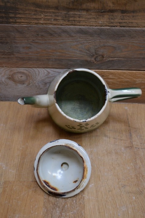 Het is een tweedehands vintage koffiepotje dat jarenlang dienst heeft gedaan en is daardoor wat gehavend met gebruikssporen. De kan, kan niet meer gebruikt worden als koffiepot maar blijft mooi als decoratie of plantengieter.