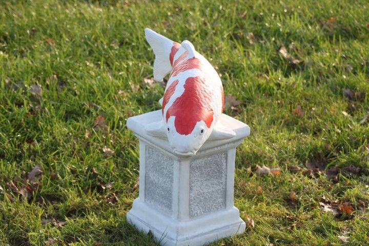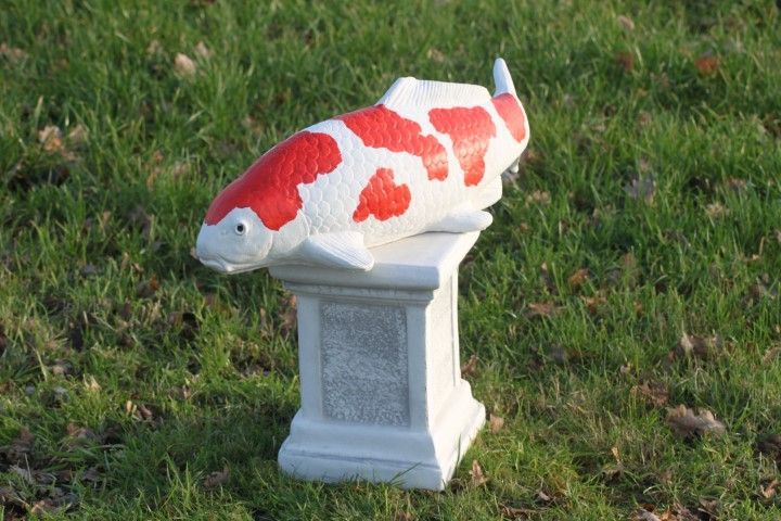 De Kohaku is een witte vis met rode tekening, waarschijnlijk de meest bekende en populaire koi-variëteit sinds eind 19e eeuw. Het rood moet diep en egaal zijn; een klein beetje rood in de borstvinnen is toegestaan, maar exemplaren zonder rood in de vinnen worden hoger gewaardeerd. Het beeld wordt geleverd exclusief sokkel, die u apart kunt bijbestellen. Een prachtig accent voor vijver of tuin, dat rust en schoonheid uitstraalt.