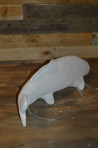 Betonnen tuinbeeld van een springende koi uit het water. Dit beeld kan ook op een pompje aangesloten worden om water te laten spuiten.