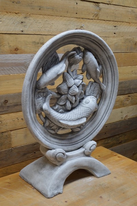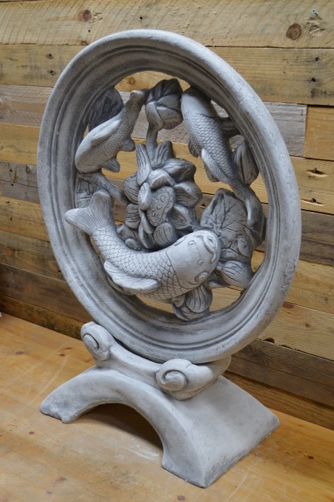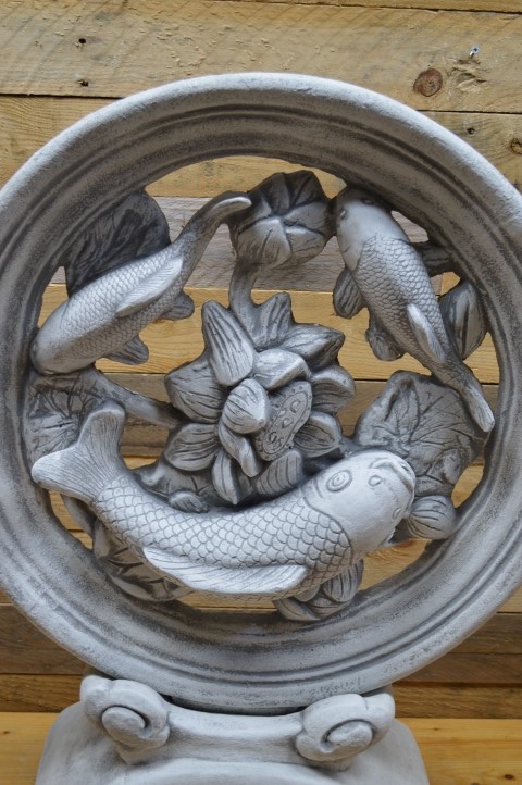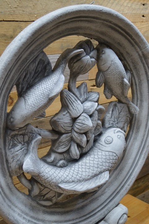 Dit betonnen beeld koiwiel moeder met jongen is een prachtig en uniek stuk voor iedere tuin of vijveromgeving. Het koiwiel toont een moeder met twee jongen op een sierlijke bloemenachtergrond en is bijzonder geschikt als wanddecoratie tegen een muur of schutting. Dankzij de gestileerde vormgeving en het natuurlijke betoneffect komt dit beeld schitterend tot zijn recht bij een koi karper vijver. Een echte aanwinst voor koi-liefhebbers die op zoek zijn naar een bijzondere sfeerbrenger.