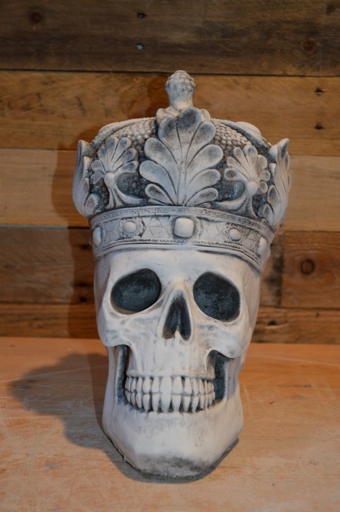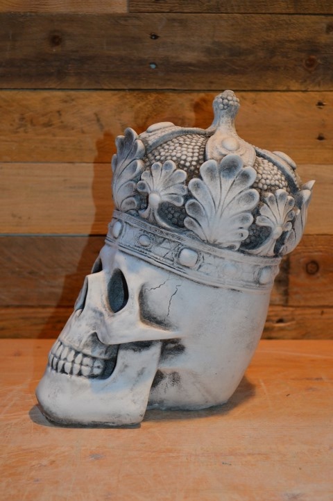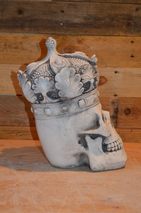 Schedel met kroon is een opvallend betonnen beeld van een doodskop met een koninklijke kroon, rijkelijk versierd met bladeren. Dit gotische decoratiestuk is een echte blikvanger, of u het nu in de tuin plaatst, op een terras of in een interieur met een alternatieve stijl. Het beeld is gemaakt van duurzaam beton (ook wel gietsteen genoemd) en is verfijnd in detail. Perfect als sfeermaker of als statement piece.