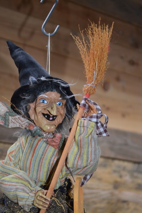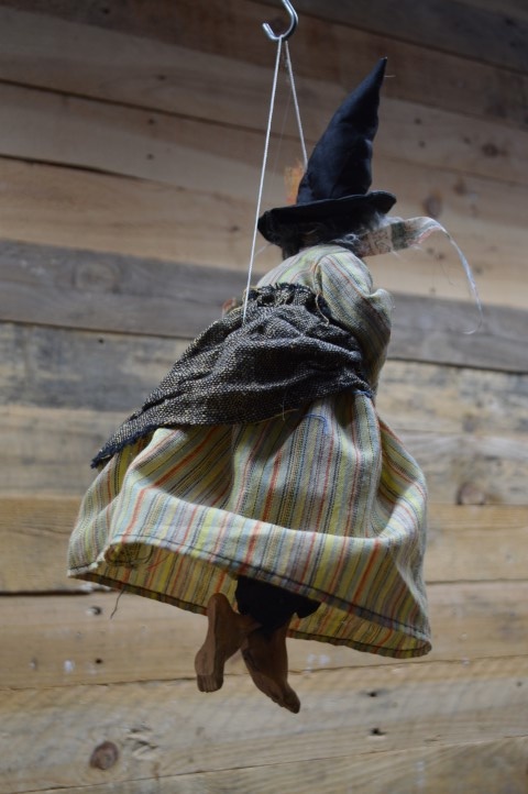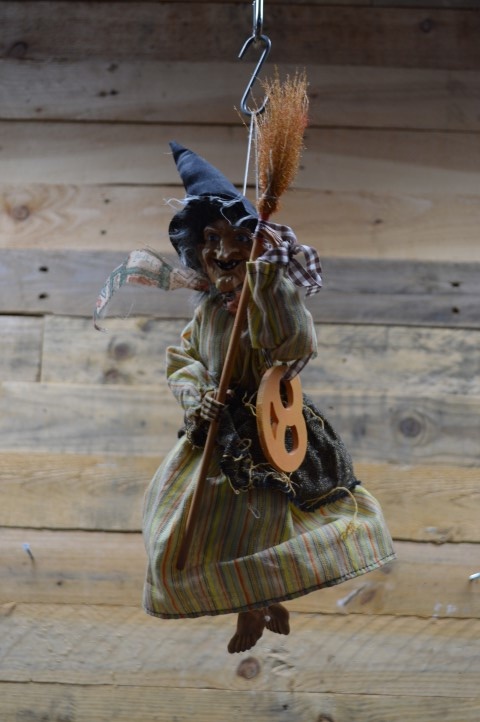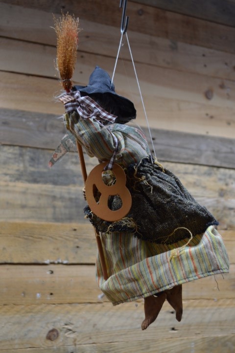 Ouderwetse hangende heksenpop met een krakeling en bezem. Deze pop is ideaal als vintage Halloween decoratie in huis en kan overal goed hangen, zoals boven een kast, voor het raam of bij de deur.