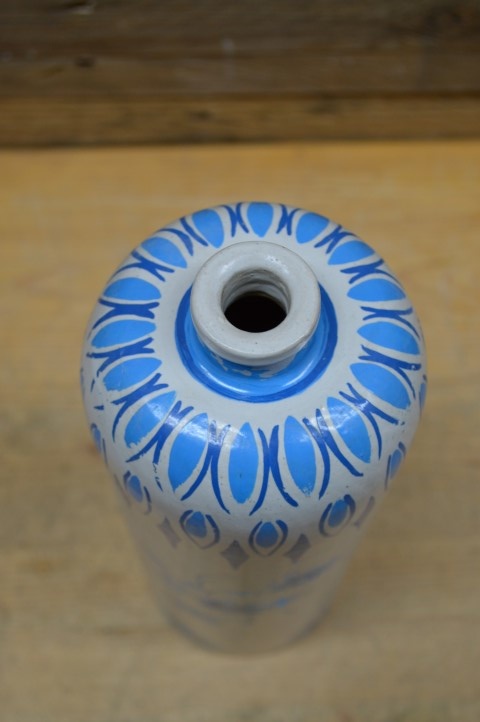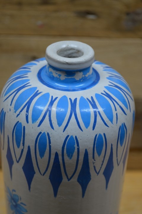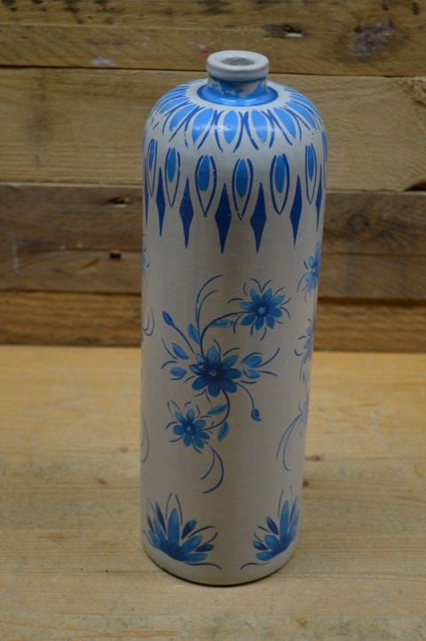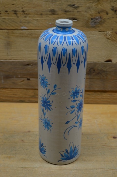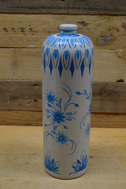 Handbeschilderde aardenwerk kruik met de inhoud van 1 liter. Deze mooie vintage kruik in een grijs getinte ondergrond met blauwe korenbloemen erop geschilderd. De decoratieve kruik van keramiek is beschilderd met bloemen en andere motieven en is ideaal als toevoeging aan een lege vensterbank of een leuke kast of tafel.