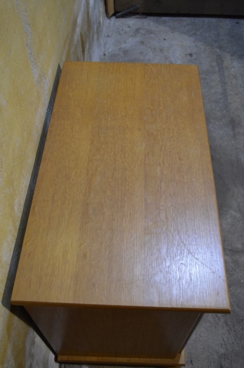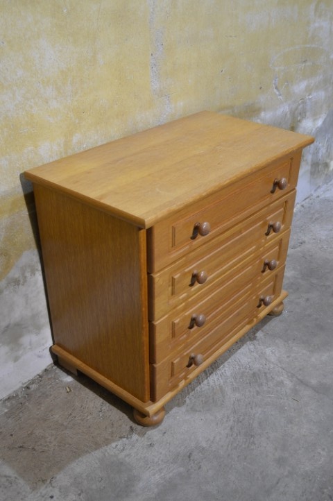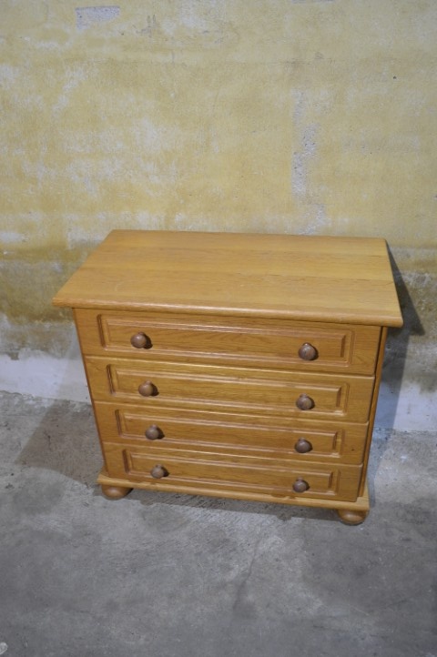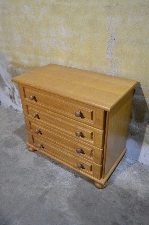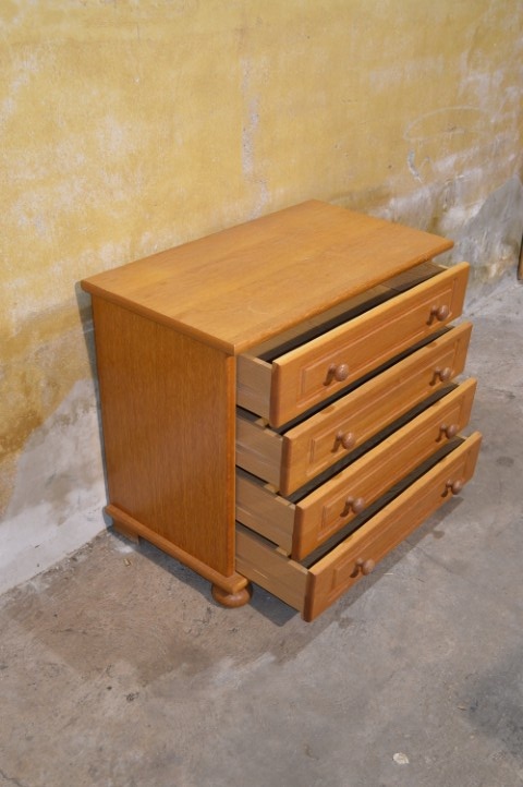 Een compact meubel met een warme vintage uitstraling. Dit blank eiken ladenkastje is een ladekast uit de jaren 70 uitgevoerd in eikenfineer. Het kastje heeft vier praktische lades met karakteristieke handgrepen en een mooie natuurlijke houttint die goed past in zowel een modern als vintage interieur. Door het bescheiden formaat is het kastje veelzijdig inzetbaar, bijvoorbeeld in een hal voor kleine spullen, in een slaapkamer als nachtkastje of in een kinderkamer voor kleding en speelgoed. Het meubel verkeert in goede vintage staat met gebruikssporen passend bij de leeftijd.
