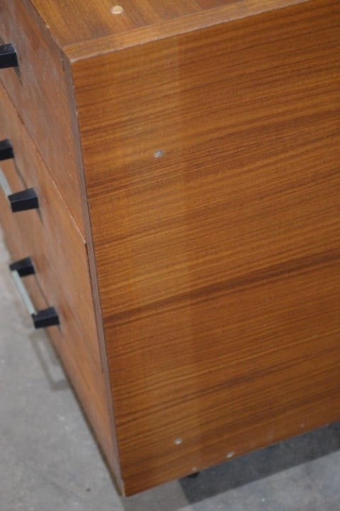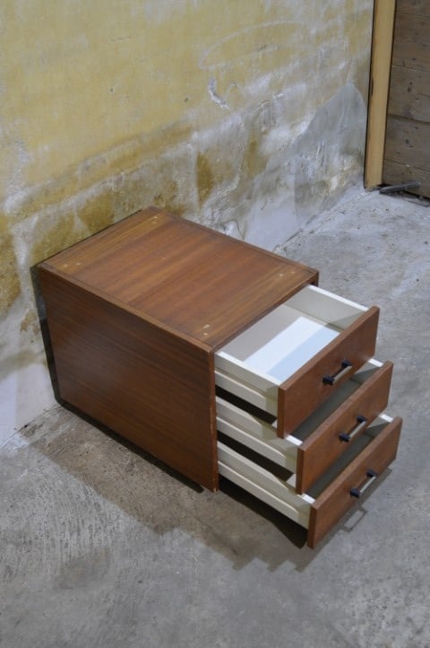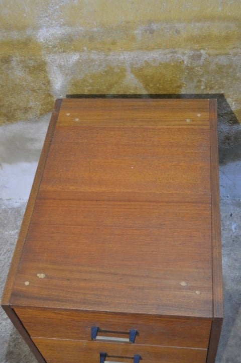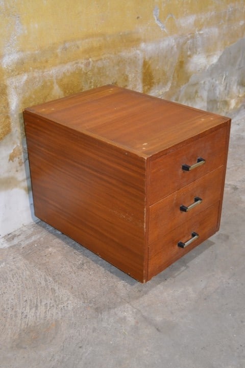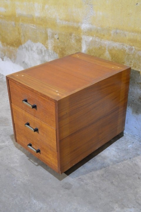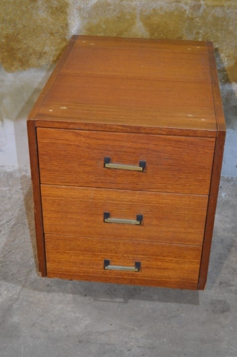 Deze mid century ladekast van teak fineer op wieltjes met metalen handgrepen is een praktisch en stijlvol meubel uit de jaren 60. Het kastje beschikt over drie ruime laden en is dankzij de wieltjes eenvoudig te verplaatsen. Het strakke Deense design maakt dit meubel veelzijdig in gebruik. Ideaal als ladeblok onder een bureau, maar ook zeer geschikt als bijzetkastje voor bestek, papieren of andere kleine spullen. De warme uitstraling van het teak fineer gecombineerd met de metalen handgrepen zorgt voor een typisch mid century karakter dat goed past in zowel moderne als vintage interieurs. Het meubel heeft gebruikssporen passend bij de leeftijd, waaronder gaten in het fineer aan de zijkant.