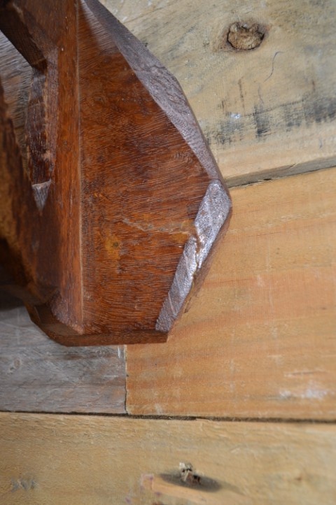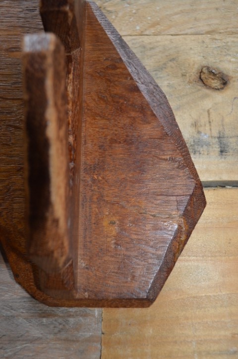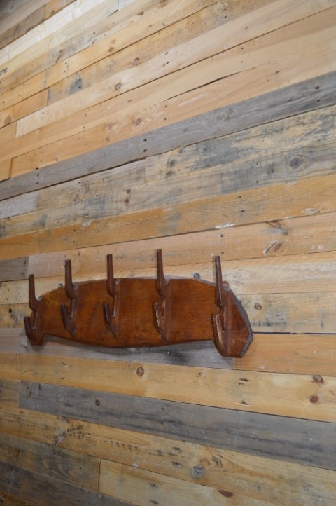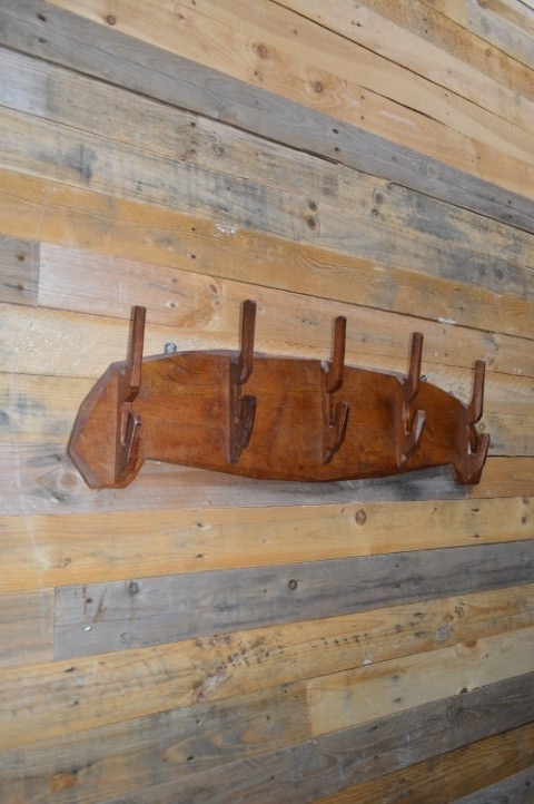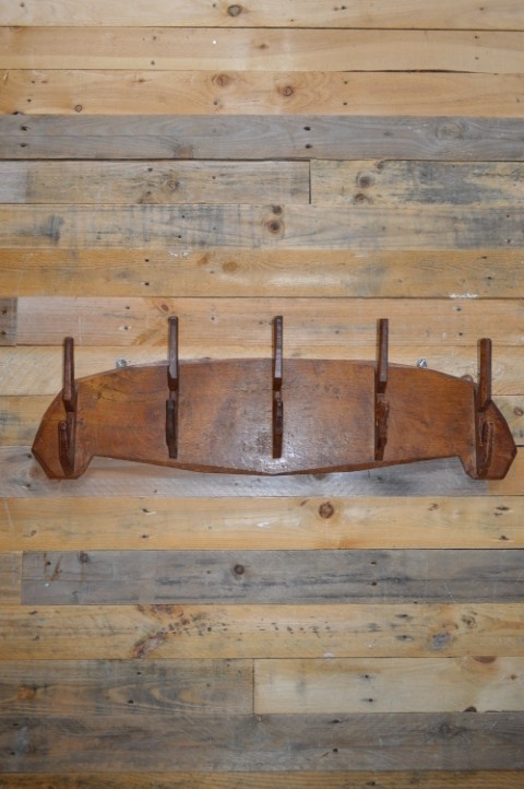 De jashaken zijn uit hout gesneden en bieden twee gebruiksmogelijkheden, waardoor er veel jassen opgehangen kunnen worden. De warme houtkleur maakt de boeren kapstok hout geschikt voor zowel landelijke als hypermoderne interieurs. Lichte gebruikssporen geven het tweedehands karakter extra charme.