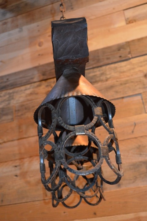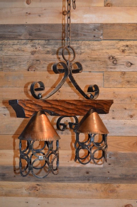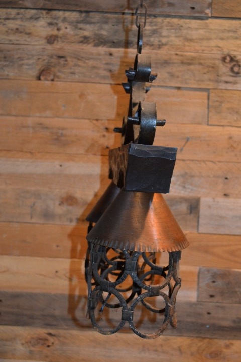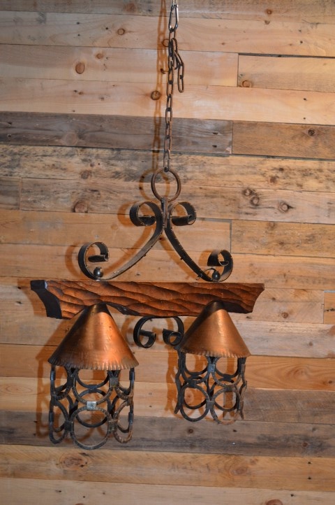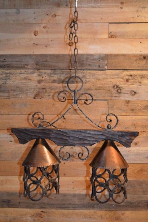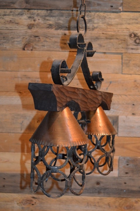 Vintage hanglamp voor boven de eettafel. Een luster met smeedijzeren elementen alsook hout en koper. Kortom een mooie landelijke hanglamp. Een smeedijzeren frame met een houten dwarsbalk en twee hanglampen met koperen kapjes.