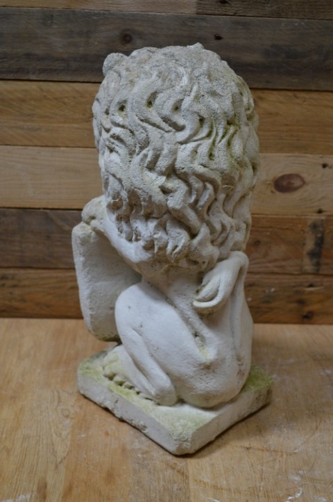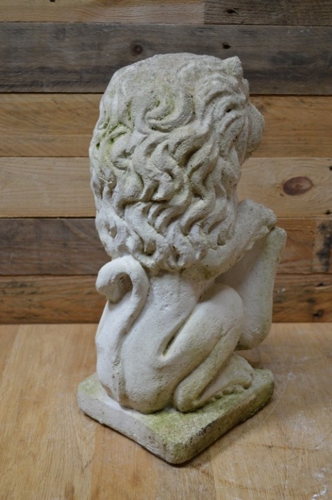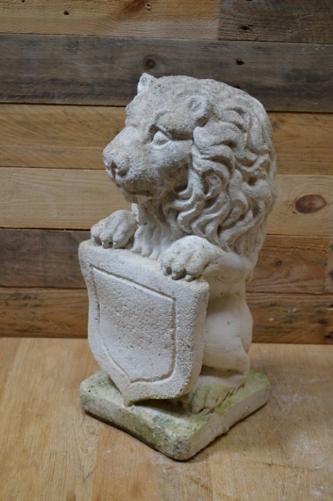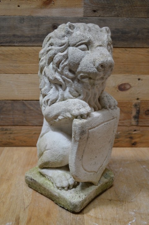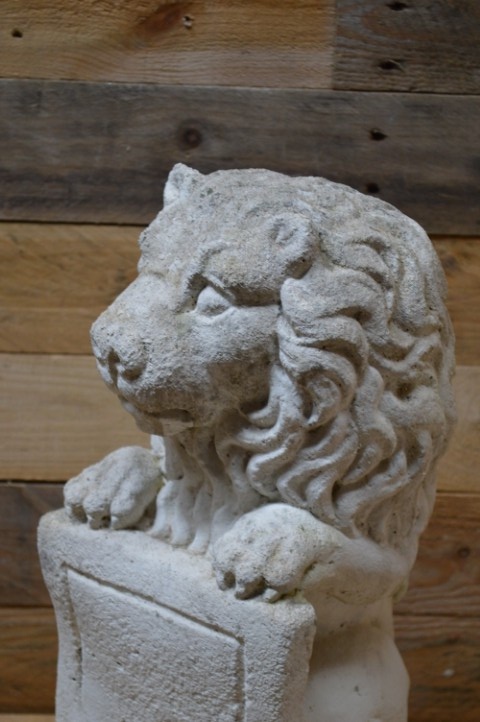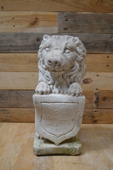 Dit betonnen beeld leeuw met wapenschild is een robuust tweedehands exemplaar met karakter. De leeuw kijkt trots naar rechts en houdt een klassiek wapenschild vast. Door jarenlang buiten te hebben gestaan, heeft het beeld een prachtig verweerd en geleefd uiterlijk gekregen. Dit maakt het een uniek en decoratief stuk voor een tuin, oprit of entree. Het beeld is zwaar, stabiel en weersbestendig, perfect voor wie op zoek is naar een stoer, klassiek tuinbeeld met geschiedenis.