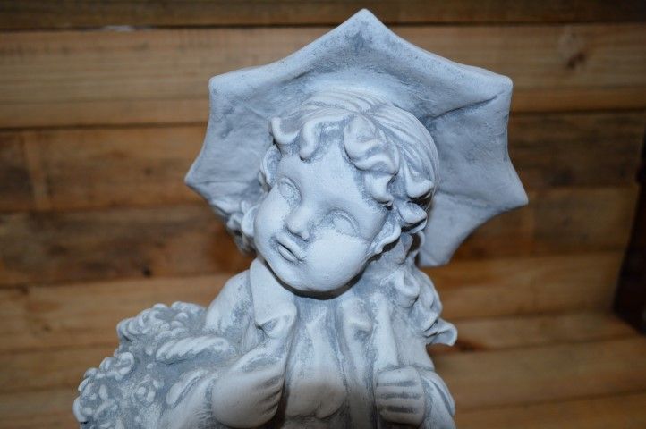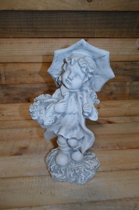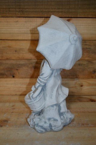 Een tafereel vol charme en finesse. Het betonnen beeld meisje met paraplu staat elegant met een mandje aan haar arm, klaar om een vrolijk accent te geven aan uw tuin of vensterbank.
