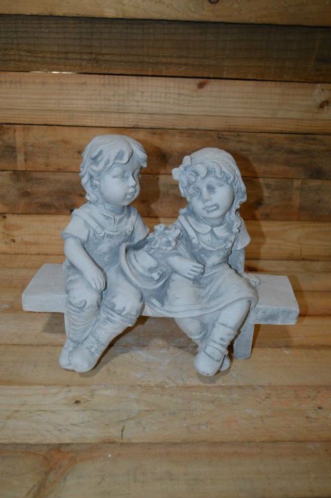 Een zonnig tafereel dat meteen een glimlach oproept. Dit betonnen beeld kinderen op bankje laat een jongetje en meisje zien die vrolijk met elkaar flirten.
