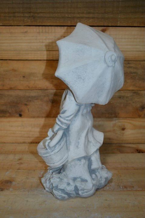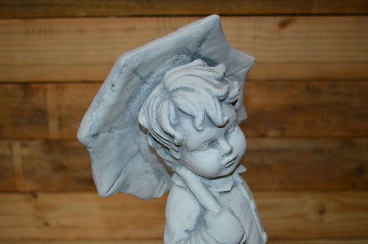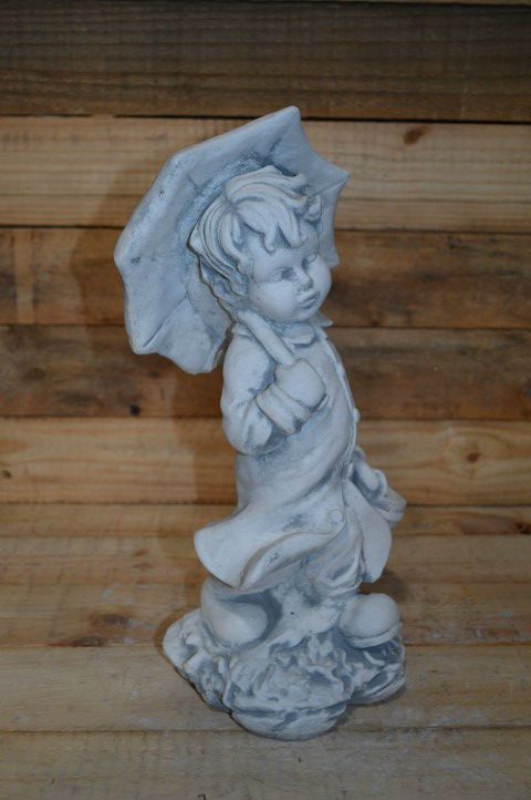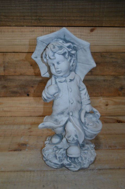 Een vrolijk tafereel vol speelsheid en charme. Het betonnen beeld jongetje met paraplu loopt moedig door regen en wind met zijn mandje, klaar om boodschappen te doen.