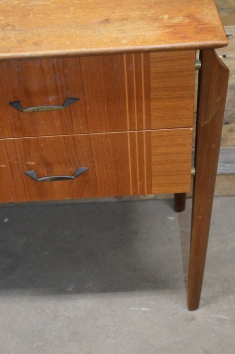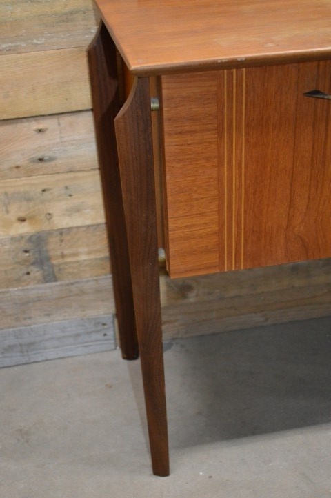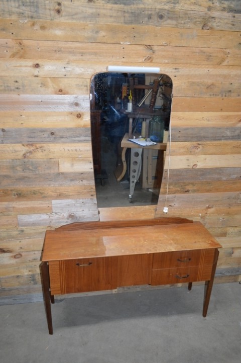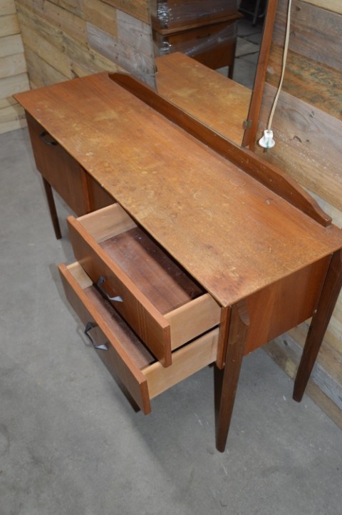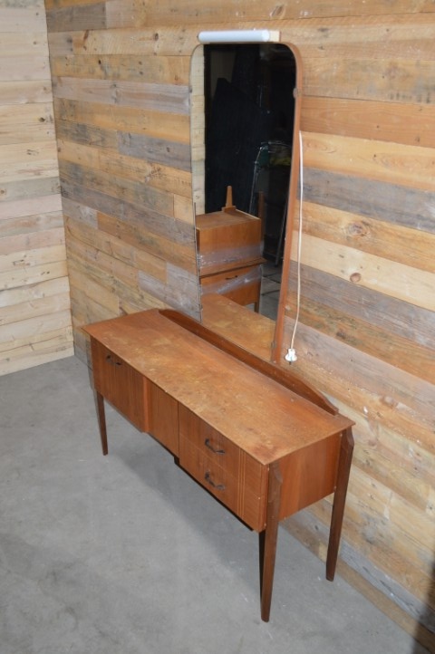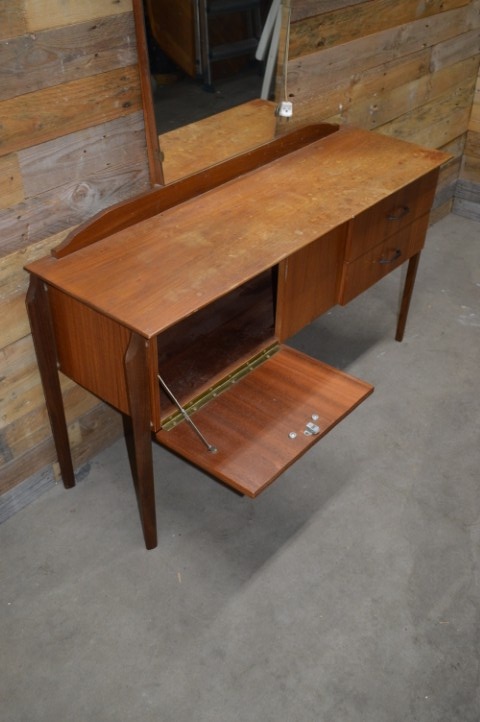 Een fantastische retro kaptafel uit de jaren 60 van de ontwerper Louis van Teeffelen. Louis van Teeffelen heeft hoofdzakelijk ontworpen voor de meubelfabriek WéBé. De kaptafel heeft 2 handige laadjes en een klepdeurtje, genoeg plek om je make-up in op te bergen dus. Je kunt de kaptafel ook gewoon neerzetten in de hal, woonkamer of andere plek in huis. De spiegel is demontabel waardoor het ook een leuk kastje kan worden. De kaptafel is gemaakt van teakhout en teakfineer.
