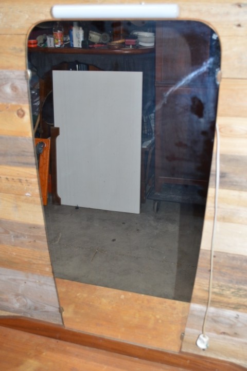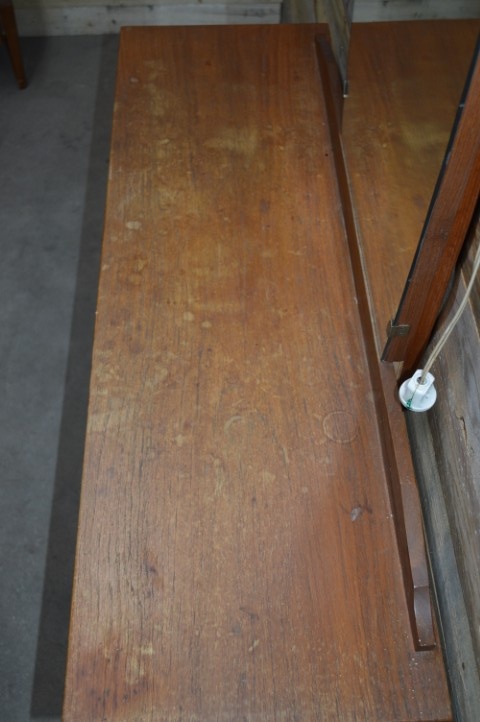 Deze veelgebruikte vintage kaptafel heeft gebruikssporen. Er zitten vlekken op het blad en puntjes in de spiegellaag.