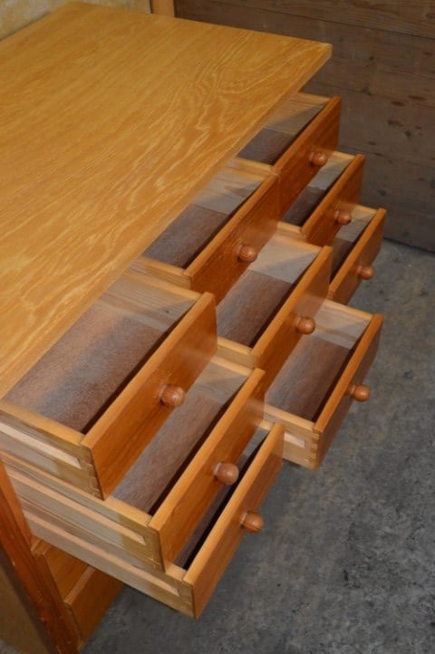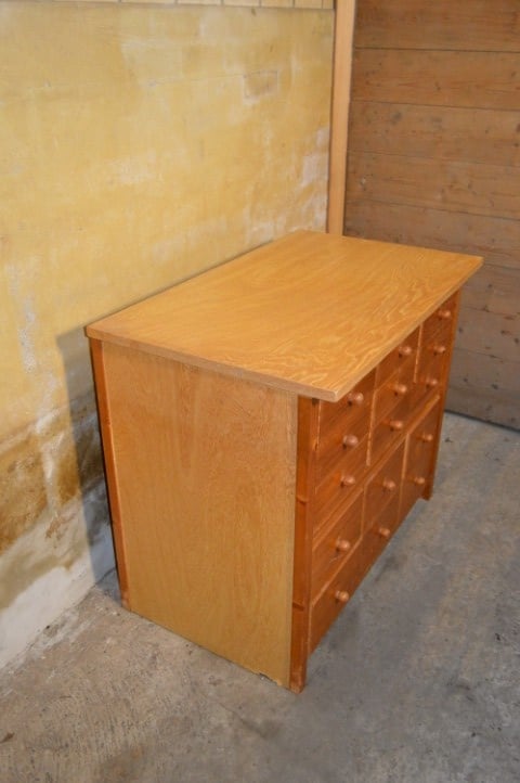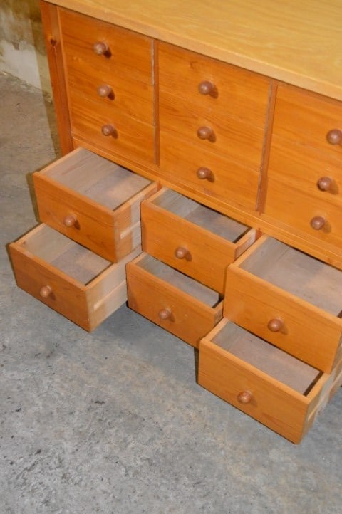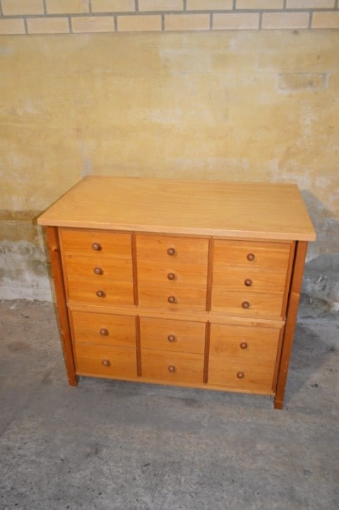 Een praktische Lundia ladekast uit de jaren 60 met maar liefst 15 identieke laden. Deze grenen kast combineert tijdloos design met functionele opbergruimte. De vijftien laden met houten knoppen zorgen voor overzicht en rust in keuken, woonkamer of werkkamer. De kast verkeert in goede vintage staat met gebruikssporen passend bij de leeftijd. Constructief solide en direct klaar voor gebruik. Een uniek exemplaar – slechts één beschikbaar.
