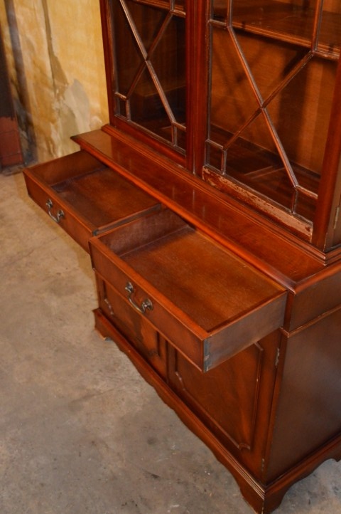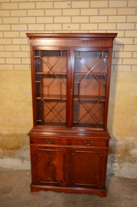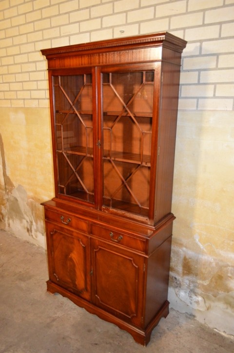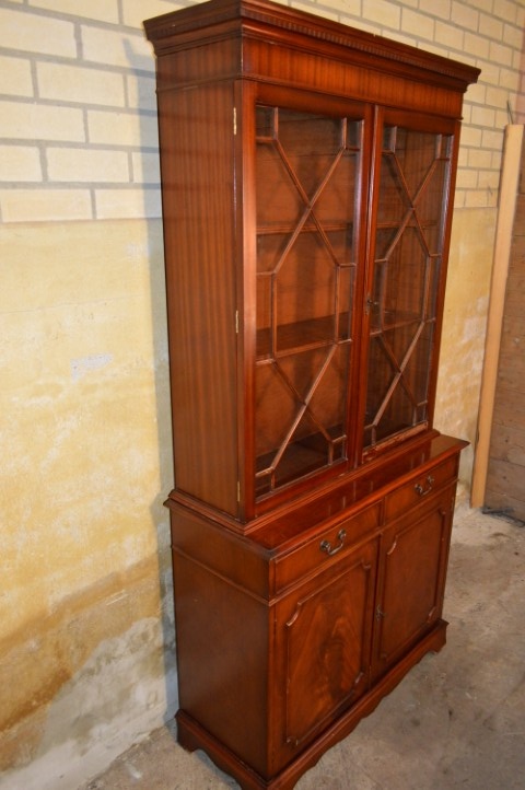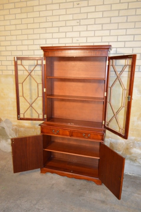 De bovenkast is voorzien van glazen deuren met planken en ingebouwde verlichting, ideaal voor het presenteren van servies, glaswerk of boeken. De onderkast beschikt over twee lades en dubbele deuren met daarachter een plank, wat zorgt voor ruime en afgesloten opbergruimte. De warme mahoniekleur en klassieke vormgeving geven de kast een statige uitstraling.