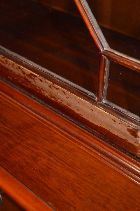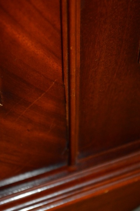 Er zijn gebruikssporen aanwezig, waaronder lakschade en kleine beschadigingen aan enkele latjes. Dit past bij de leeftijd van het meubel en draagt bij aan het authentieke karakter. Een kast voor de echte liefhebber van klassieke meubels.