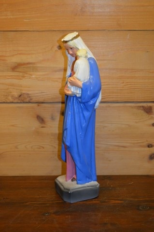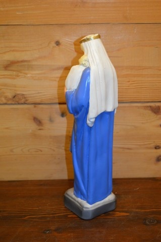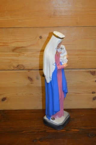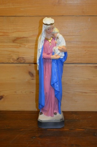Dit prachtige polyester beeldje van Maria met de kleine baby Jezus op haar arm is dankzij de kleine afmetingen ideaal om in de vensterbank of op een dressoir neer te zetten, maar kan – omdat deze van kunststof gemaakt is – ook uitstekend als tuindecoratie gebruikt worden. Dit kleine tuinbeeld is bovendien erg mooi uitgewerkt en vormt een echte blikvanger voor liefhebbers van sierlijke religieuze beeldjes.