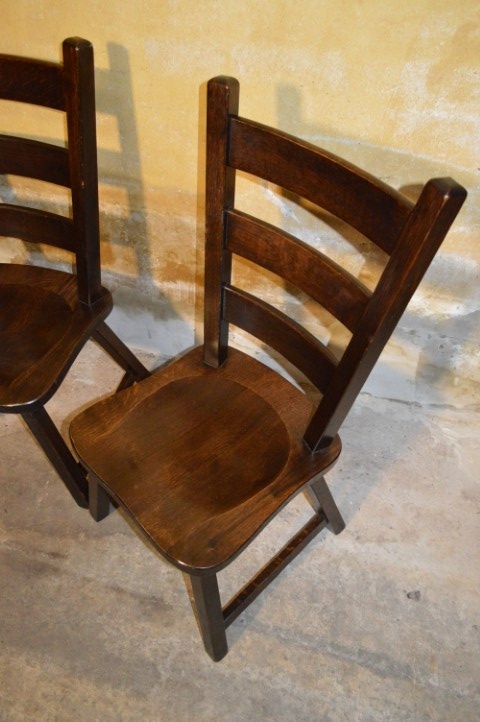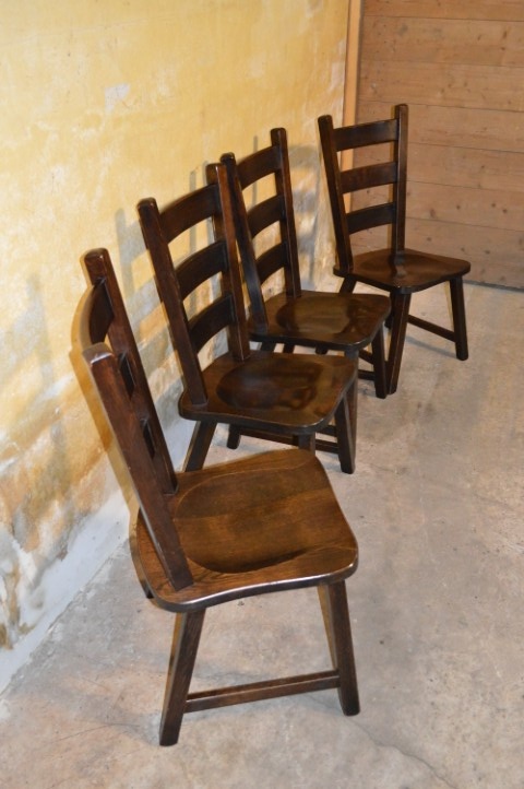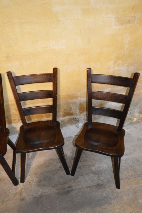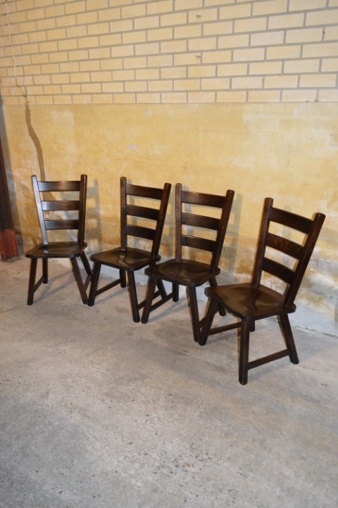 Set van 4 massief donker eiken eetkamerstoelen met een klassieke retro uitstraling. Deze stevige houten stoelen zijn ideaal voor gebruik aan een eettafel in de eetkamer of keuken. Het donkere eikenhout geeft de stoelen een warme en tijdloze sfeer.