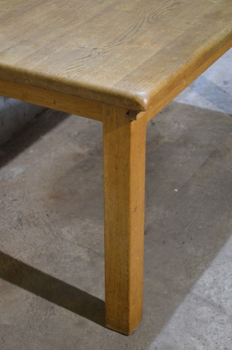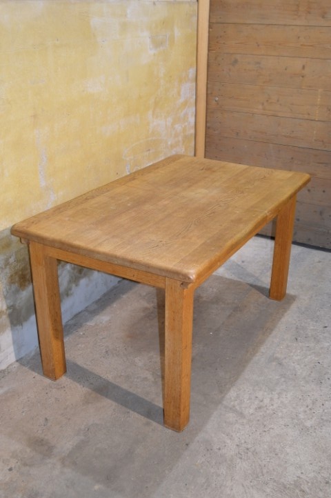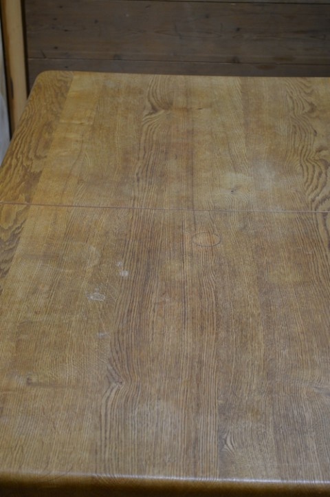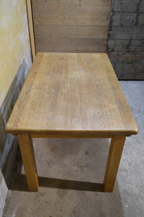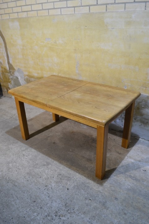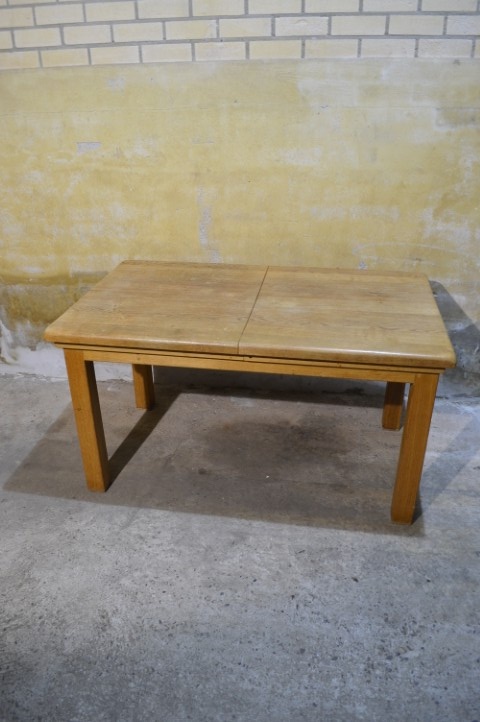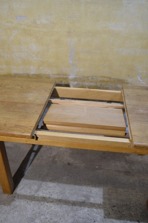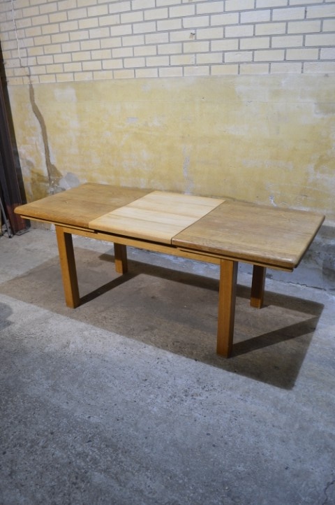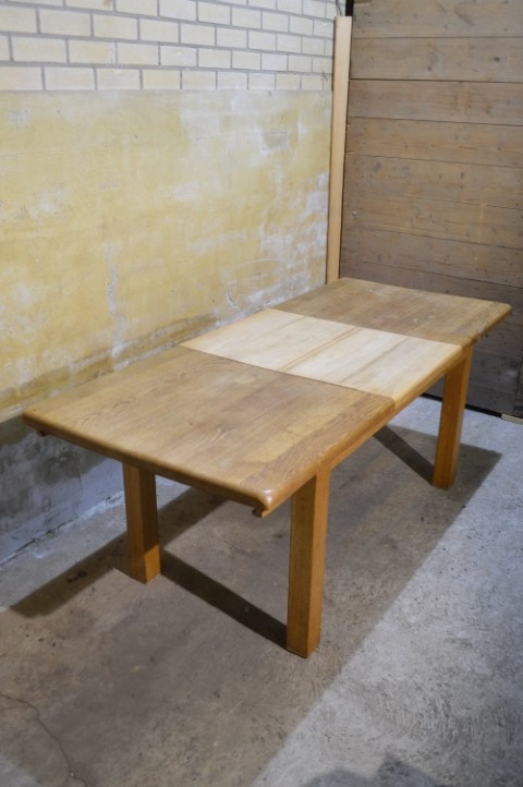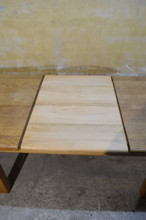 Deze massief eiken uittrektafel is een robuust en praktisch meubelstuk voor dagelijks gebruik. Het blad is voorzien van een middenplank, die altijd onder het tafelblad heeft gezeten en daardoor verkleurd is. De poten zijn niet demontabel. Het tafelblad vertoont gebruikssporen en vlekken passend bij de leeftijd, wat bijdraagt aan het authentieke karakter van de tafel.