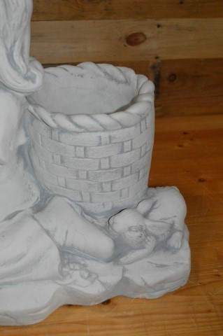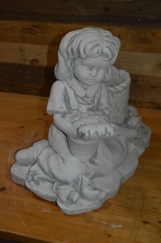 Dit aandoenlijke tuinbeeld van beton toont een zittend meisje dat liefdevol speelt met dieren bij een rijkelijk versierde bloemenmand. De bloemenmand is uitgehold en vormt een praktisch bloembakje, waarin u bloemen, kleine plantjes of vetplanten kunt plaatsen.