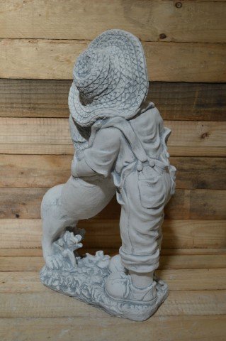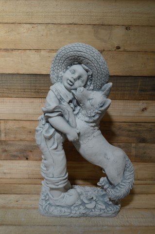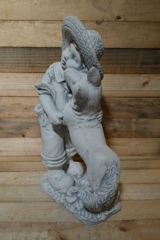 Lange omschrijving: Dit betonnen beeld toont een meisje met een strohoedje dat haar herdershond knuffelt. Het ornament is ideaal voor tuin, balkon of kinderhoek en brengt een speels en warm karakter in elke omgeving. Het duurzame beton zorgt voor een lange levensduur, terwijl het beeld een echte blikvanger is voor liefhebbers van charmante en decoratieve beelden. Perfect als cadeau of om uw buitenruimte op te vrolijken.