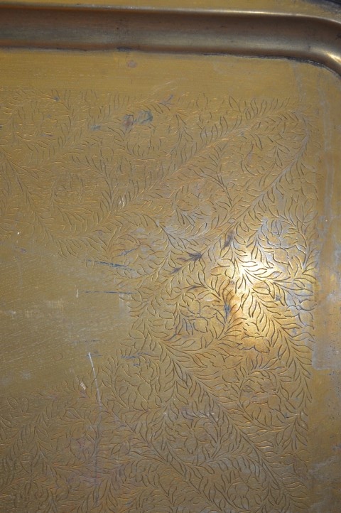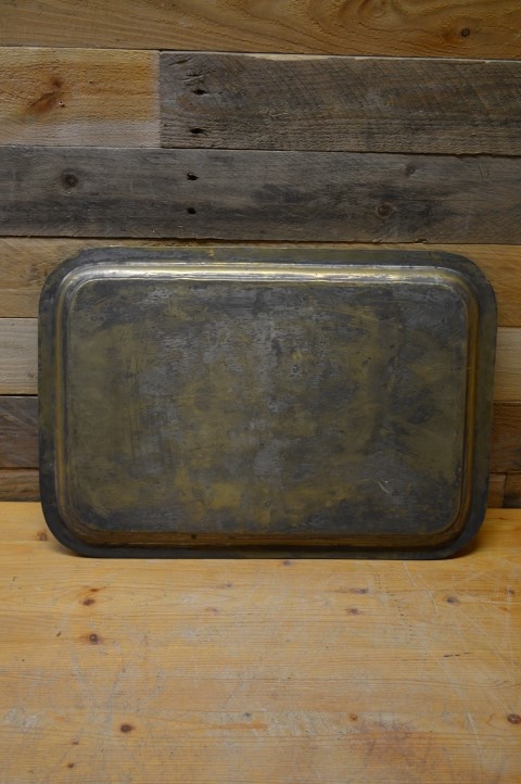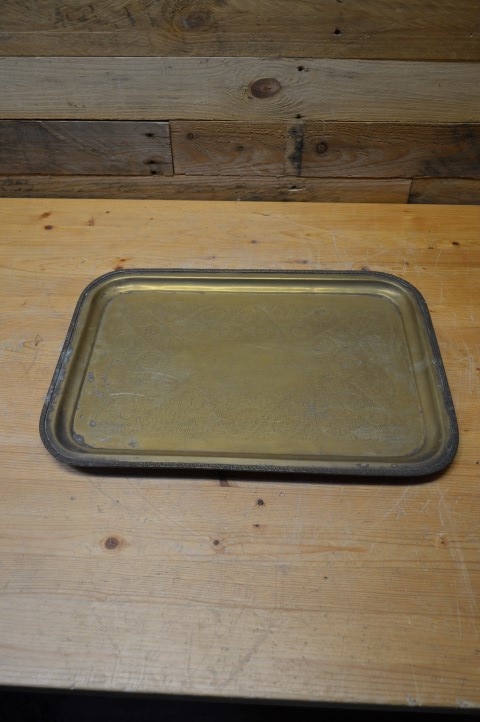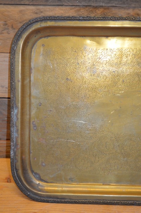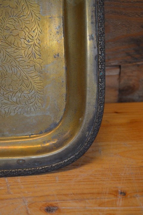 Dit vintage rechthoekige messing dienblad was ooit verzilverd maar door de tand des tijds is het messing waarvan dit serveerblad gemaakt is zichtbaar geworden. Langs de hele binnenrand van het blad is een band van bloemen ingegraveerd.