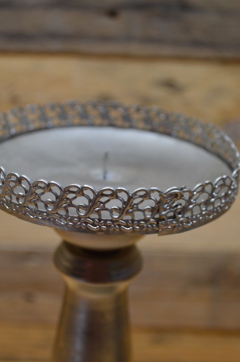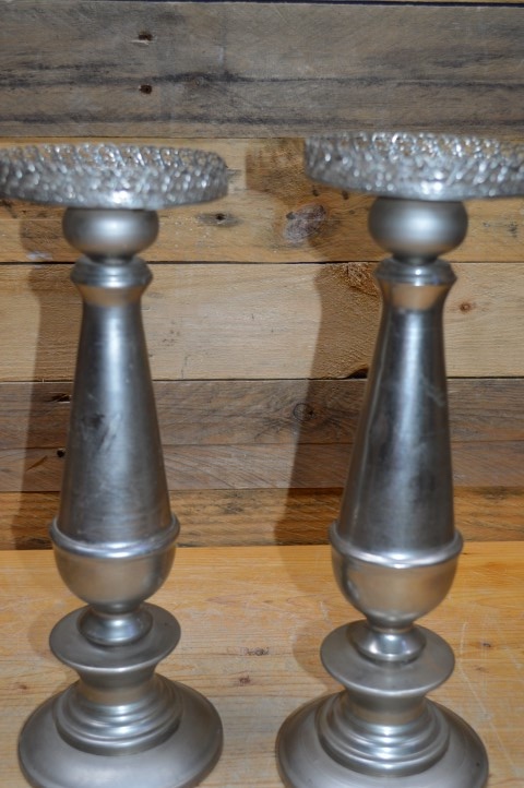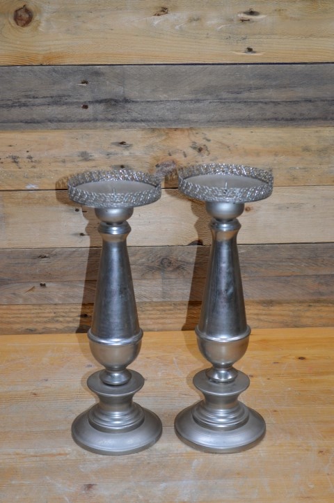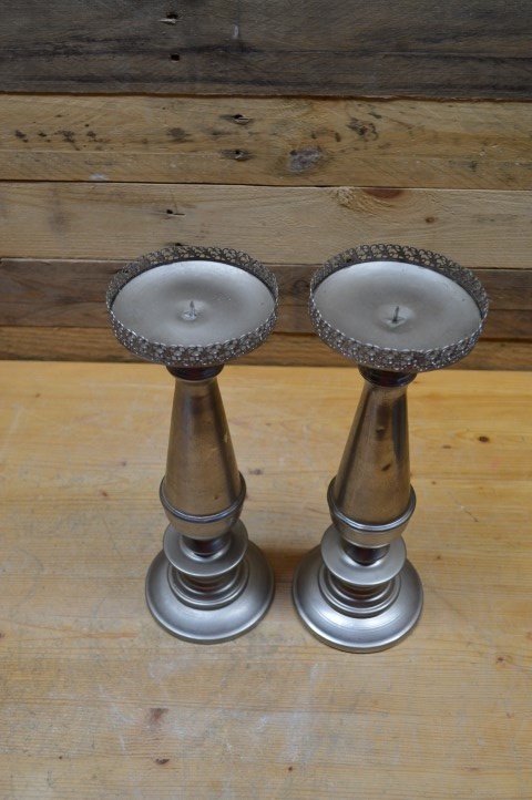 Set van 2 elegante metalen kandelaars die zeer geschikt zijn als decoratie of sfeerlicht voor op de keukentafel, bijzettafel, op een dressoir of in de vensterbank. Deze sfeerkandelaars zijn ideaal om grote kaarsen in te zetten en zijn, ondanks de aanwezigheid van gebruikssporen en wat deukjes, nog steeds in goede staat en omdat het grote kandelaars zijn, zijn deze bovendien een echte blikvanger in ieder interieur.