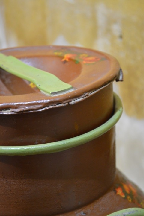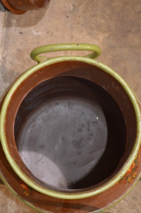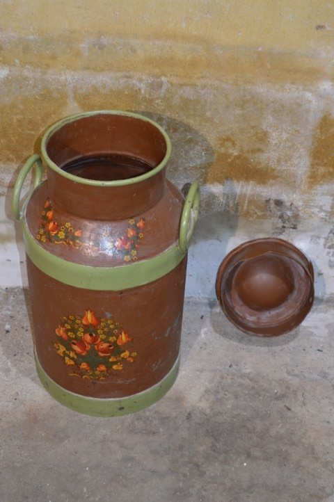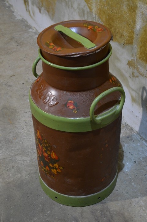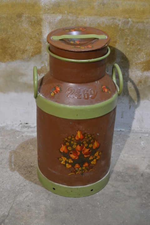 Deze vintage metalen melkbus is geschilderd en beplakt met bloemmotieven, wat zorgt voor een unieke en nostalgische uitstraling.