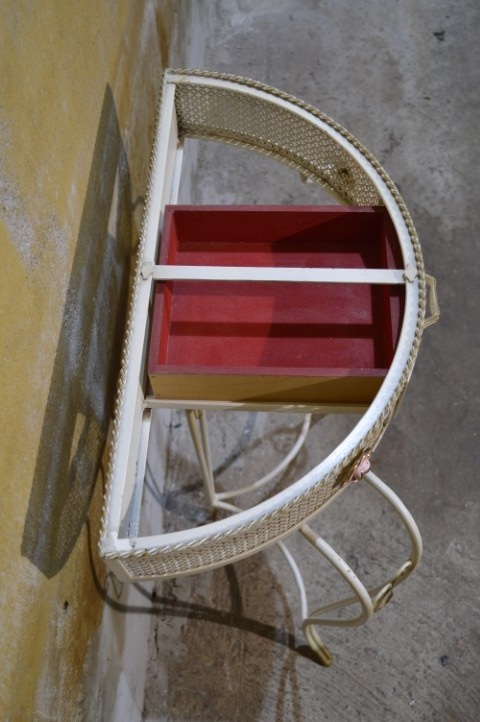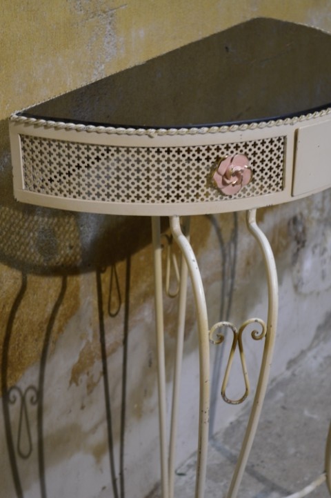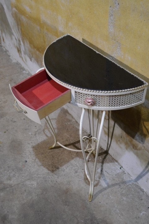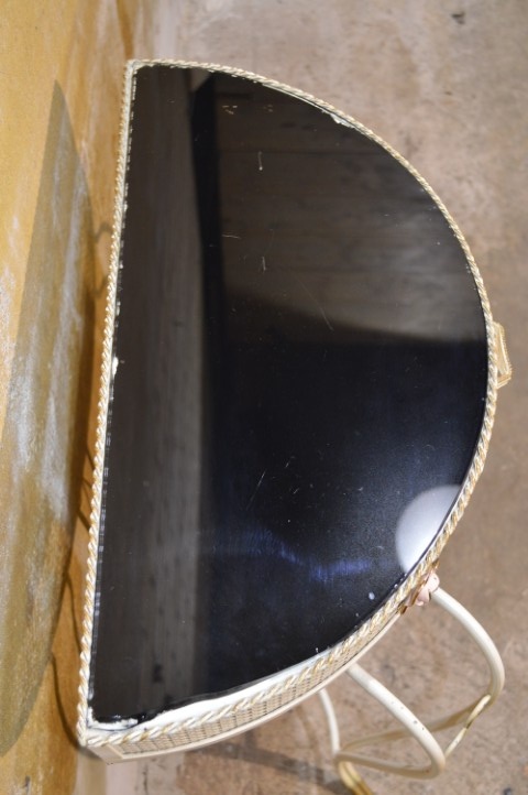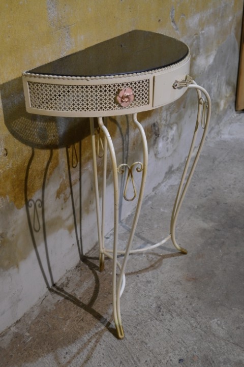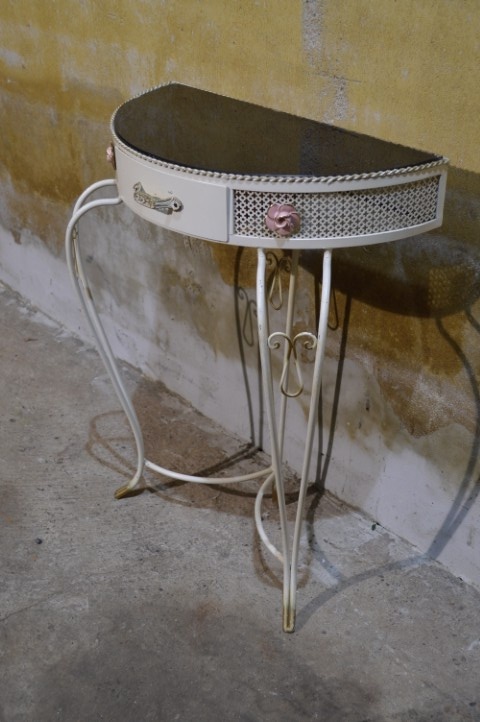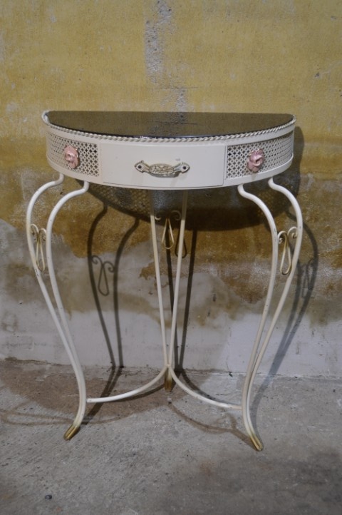 Deze Beliani COGGIA sidetable is een halfronde wandtafel met een sierlijk metalen onderstel en een vintage afwerking. Het model is voorzien van een kleine lade in het front, wat het meubel zowel decoratief als praktisch maakt. Door de halfronde vorm is deze sidetable ideaal voor plaatsing tegen een muur in de hal, woonkamer of slaapkamer. De tafel vertoont gebruikssporen en de glasplaat is in mindere staat, wat ruimte biedt voor vervanging of eigen invulling. Een stijlvol meubel met karakter en mogelijkheden.