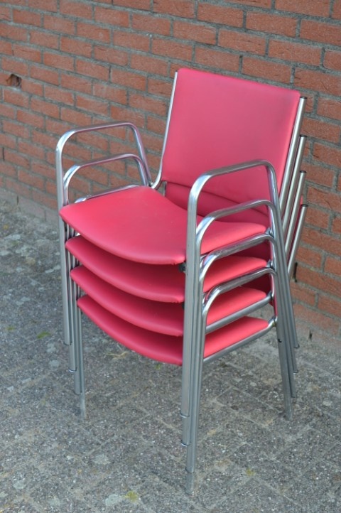 Deze set van 4 metalen stapelstoelen met skai bekleding is praktisch én stijlvol. Het stevige chroomkleurige buizenframe maakt ze stapelbaar, ideaal als extra stoelen voor onverwachts bezoek of grotere gezelschappen.