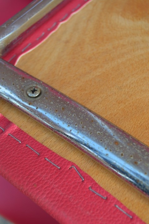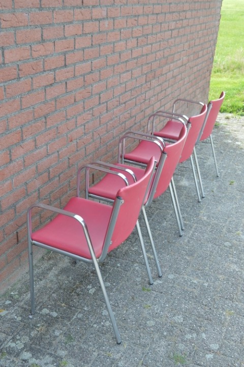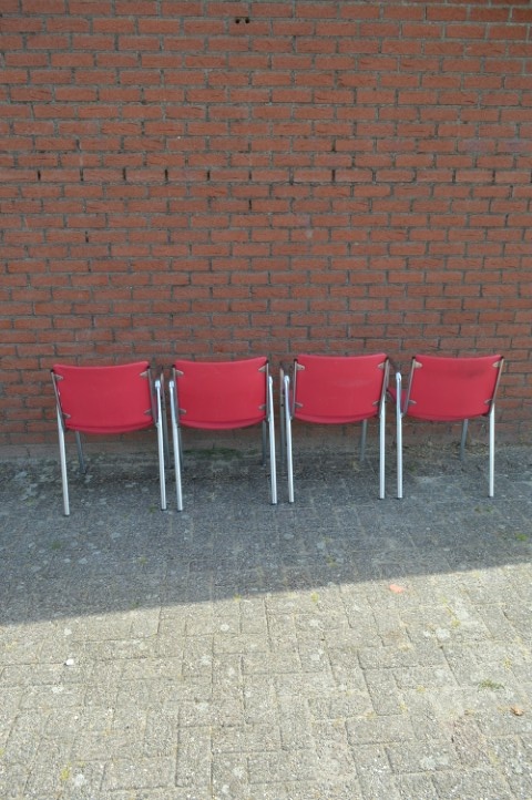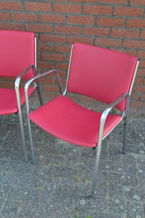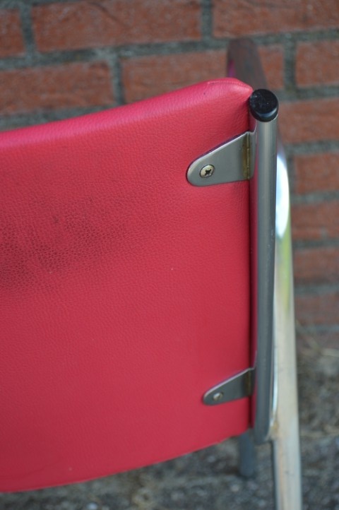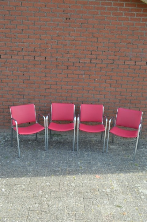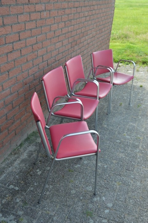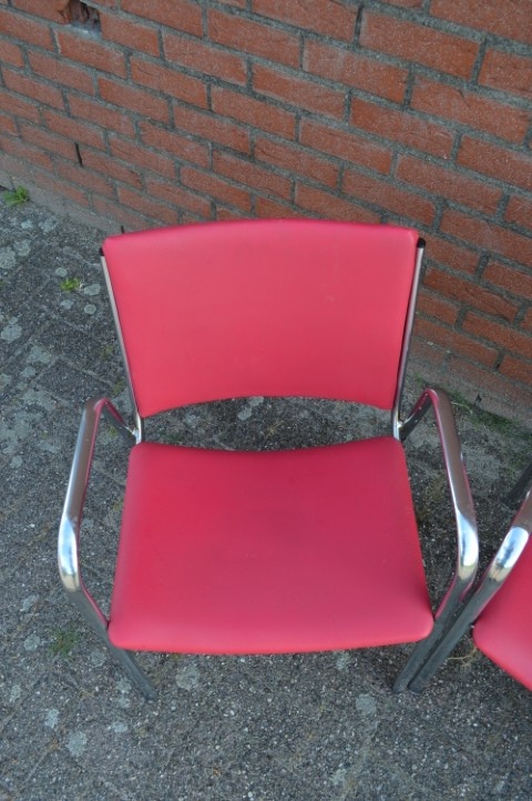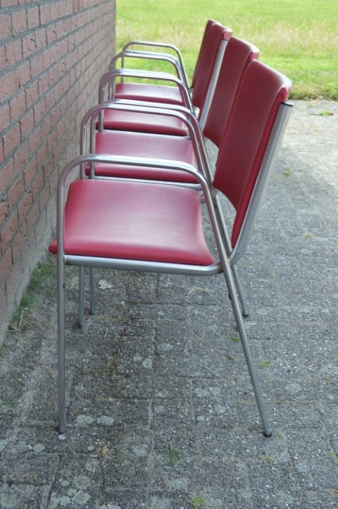De vintage stoelen zijn bekleed met donker rood skai en hebben een strakke, tijdloze uitstraling. Als tweedehands set vertonen ze lichte gebruikssporen, waaronder wat corrosie aan het chroom, maar ze zijn nog in prima bruikbare staat. Een handige en fraaie oplossing voor elk interieur.