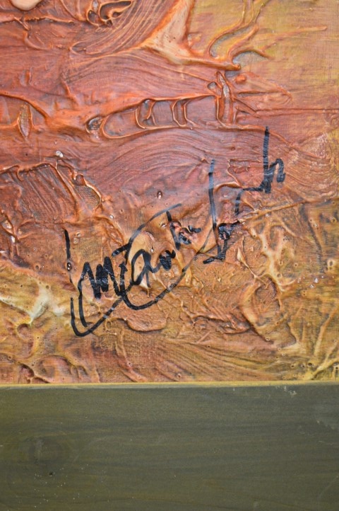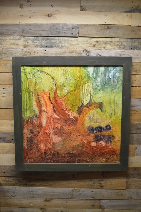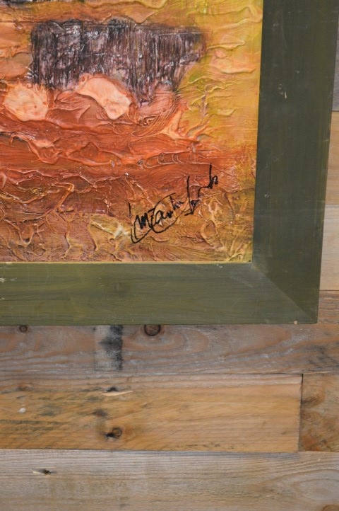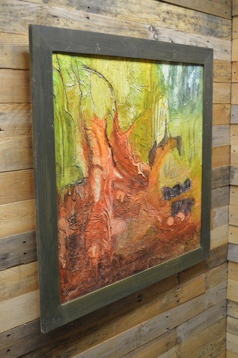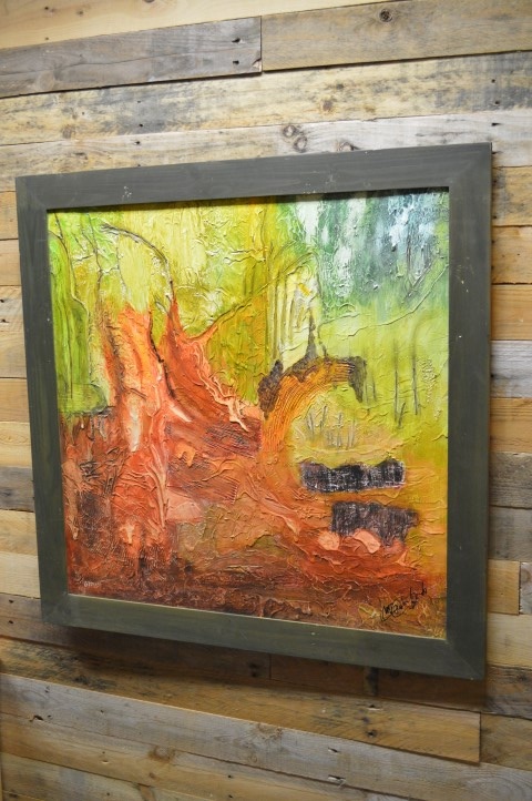 Dit abstracte schilderij van een boslandschap fleurt iedere kamer meteen op met zijn mooie warme kleuren en simpele zwarte lijst. U kunt hem bijvoorbeeld in uw woonkamer, slaapkamer, keuken of hal ophangen, het maakt niet uit want hij staat overal prachtig. De lijst heeft wel wat kleine gebruikssporen maar die doen verder niet veel af aan de schoonheid van dit schilderij.