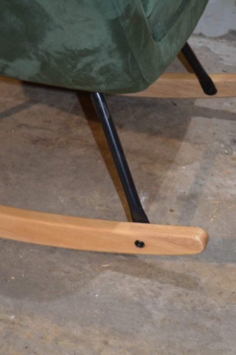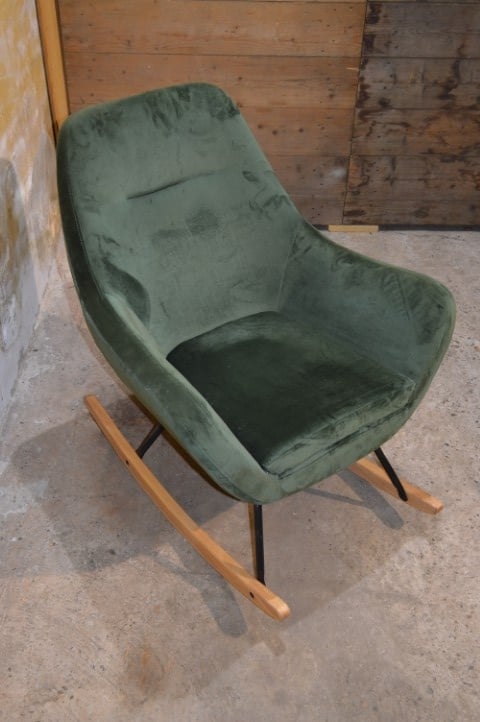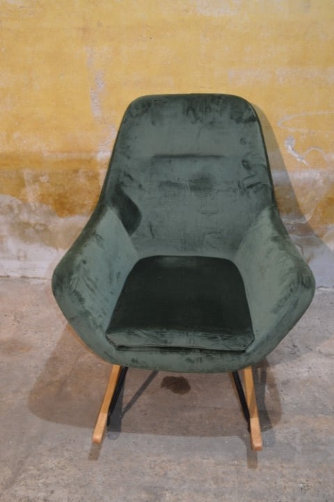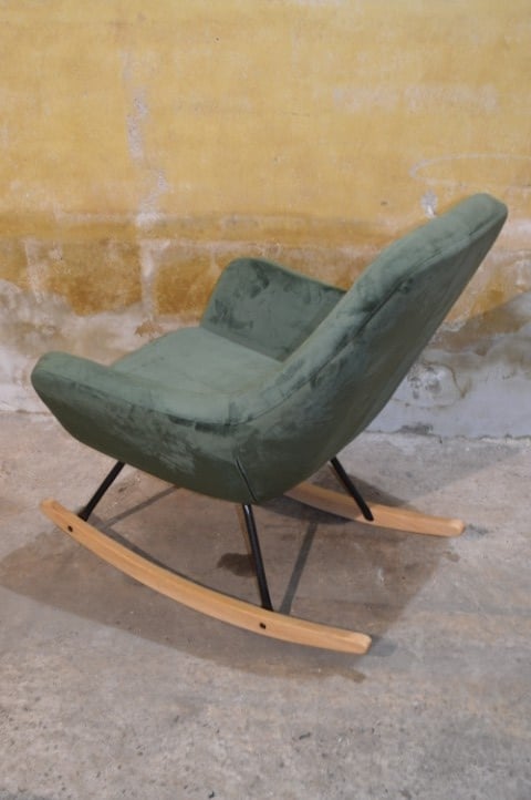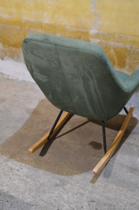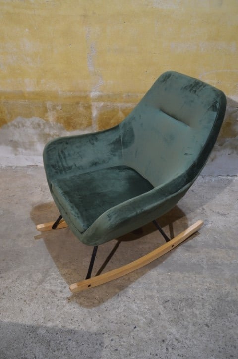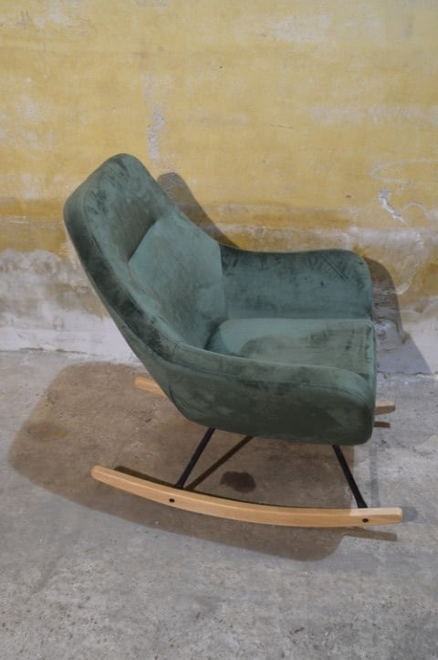 De JANNIS schommelstoel in groen heeft een modern ontwerp en een comfortabele zit. De stoel is voorzien van een metalen frame met gebogen poten van hout. De zitting, rugleuning en armleuningen zijn gevuld met koudschuim en bekleed met een duurzame stof. Dankzij de combinatie van materialen en het strakke ontwerp is deze schommelstoel geschikt voor verschillende interieurstijlen.