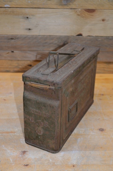Ouderwetse metalen munitiekist geproduceerd door Reeves US. Deze ouderwetse kist is een prachtige decoratie in huis maar ook goed te gebruiken als stevige opbergkist.
