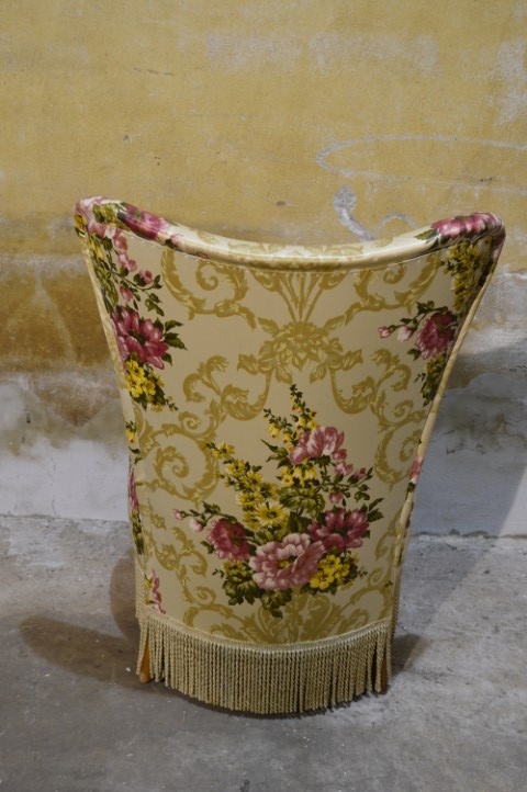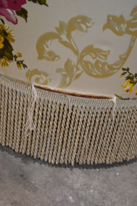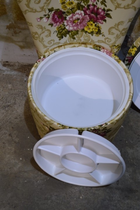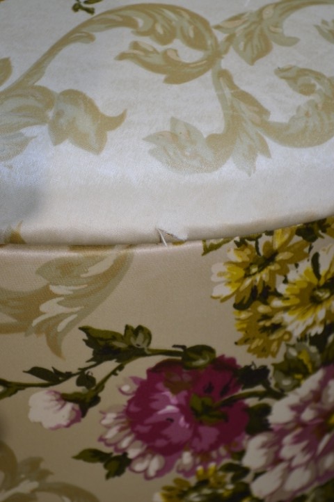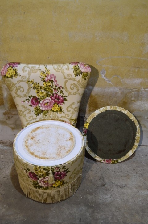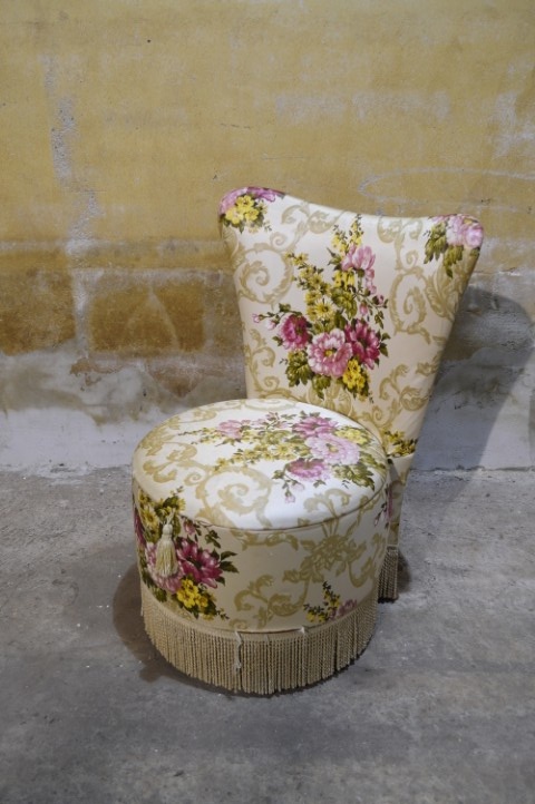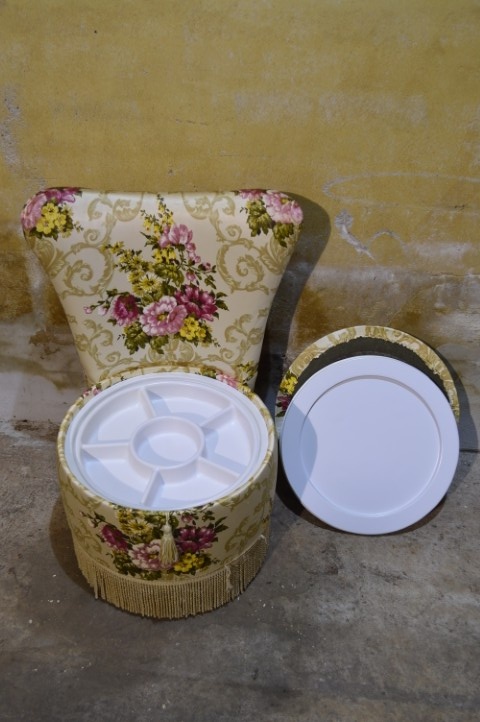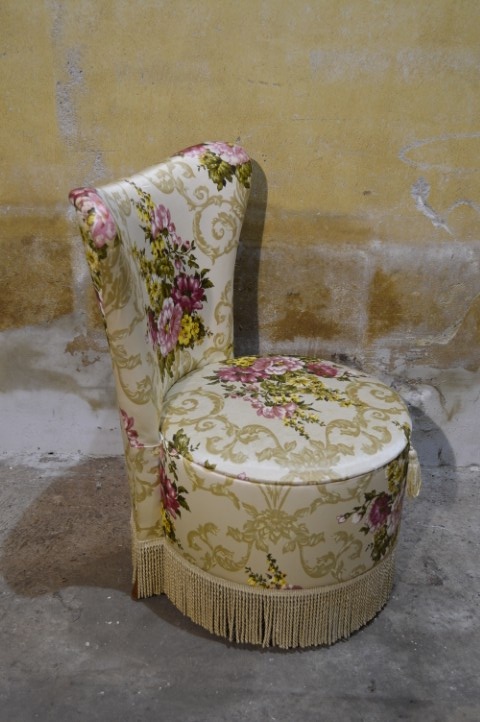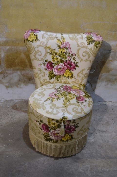 Vintage cocktail- en naaikist stoeltje uit de jaren 50 met satijnen bekleding en grote rozenprint. Dit charmante retro meubel is zowel decoratief als functioneel. Het stoeltje vertoont gebruikssporen en de satijnen bekleding heeft schade; de deksel moet worden geplakt. Ideaal voor liefhebbers van unieke retrostukken die karakter en stijl waarderen.