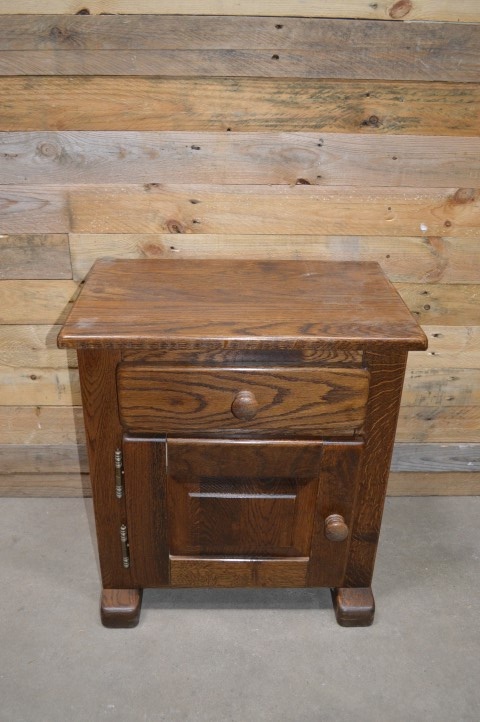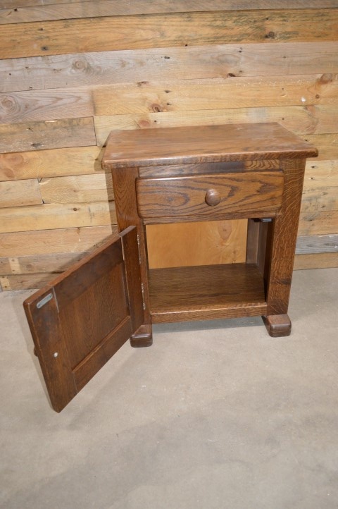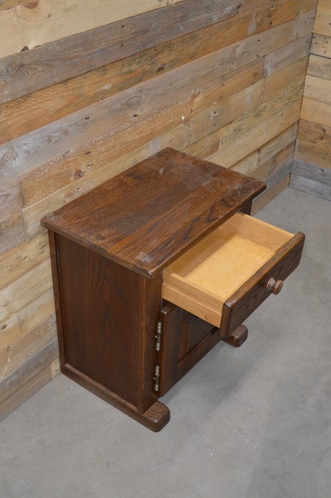 Mooi massief donker eiken nachtkastje met een ruime kastruimte en een laatje die dankzij het eenvoudige ontwerp goed naast ieder bed past. Handig om bijvoorbeeld een wekker of glas water op te zetten maar dit kastje kan daarnaast ook uitstekend als bijzetkastje gebruikt worden tussen twee fauteuils of om een mooie vaas op te zetten in een kamer of hal.
