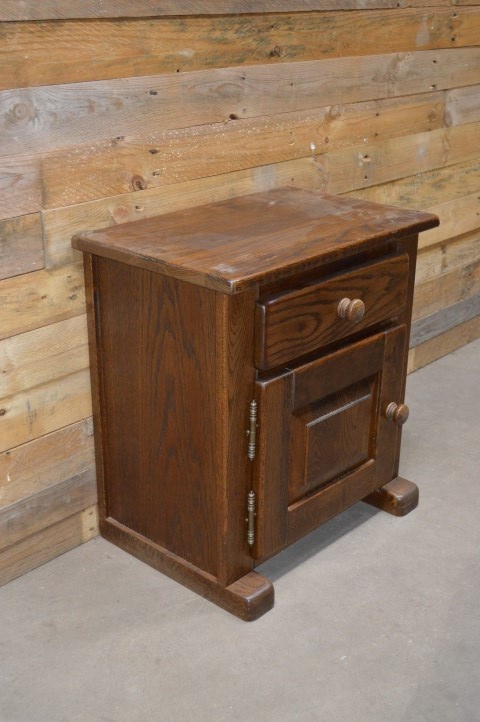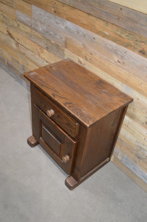 Dit nachtkastje heeft in zijn lange leven wel een aantal gebruikssporen opgelopen, maar verkeert nog in goede staat en kan dus gerust nog jaren mee.