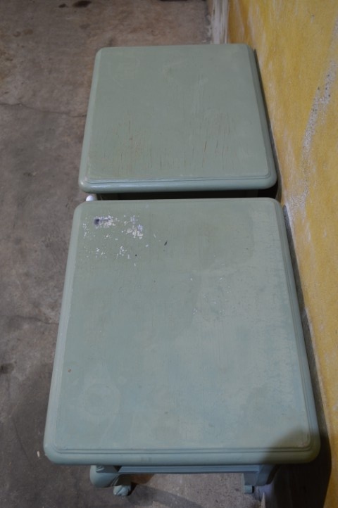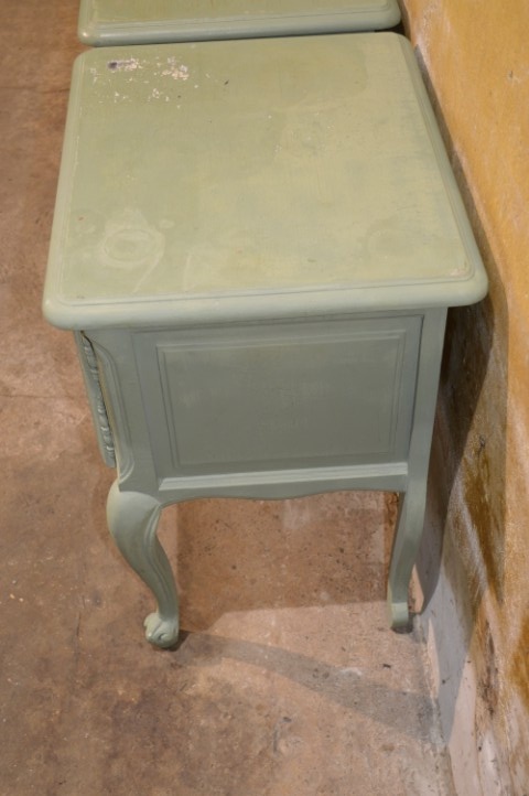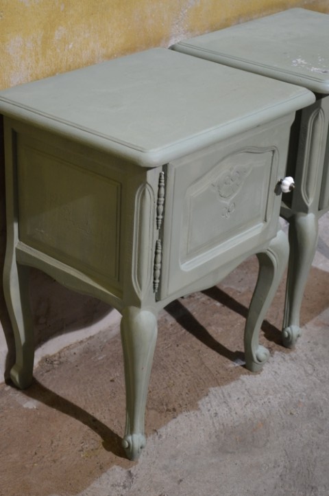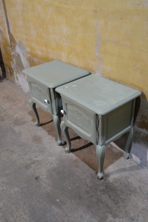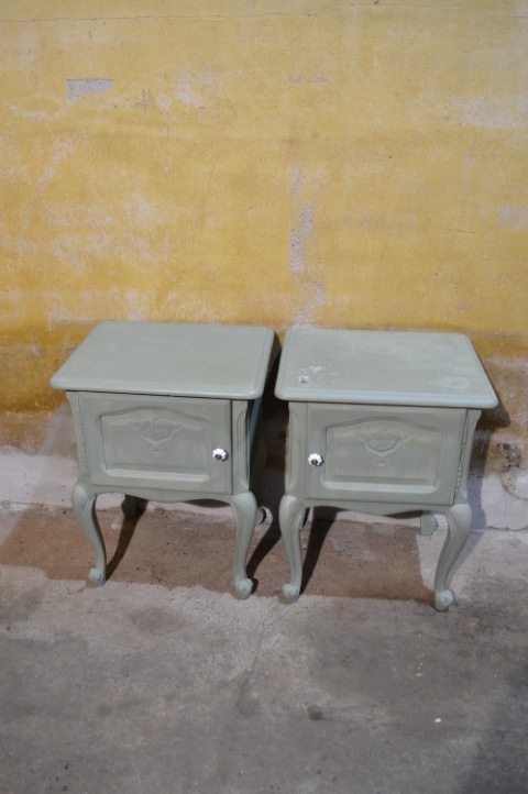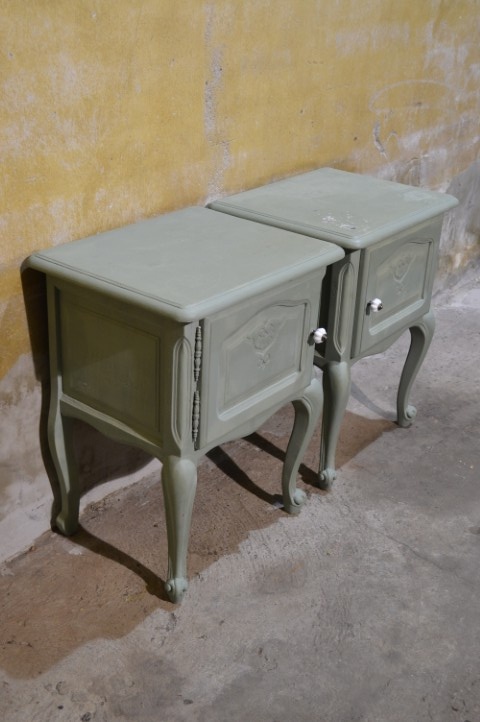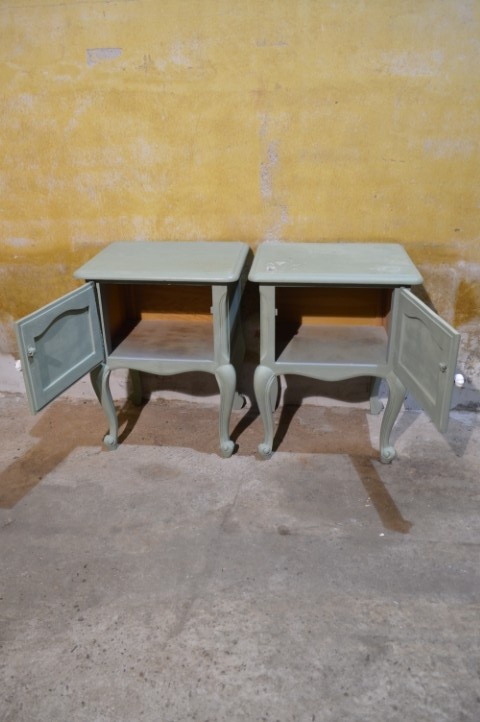 Maak kennis met deze set van twee Engelse nachtkastjes in een opvallende grijsgroene kleur. De kastjes, de een met een linksdraaiend deurtje en de ander recht draaien, zijn brocante en elegant vormgegeven, met sierlijke pootjes en verfijnde details. Ze bieden voldoende opbergruimte naast het bed en brengen een vleugje vintage charme in uw slaapkamer. De nachtkastjes vertonen gebruikssporen en zijn geschilderd, wat bijdraagt aan hun authentieke uitstraling.