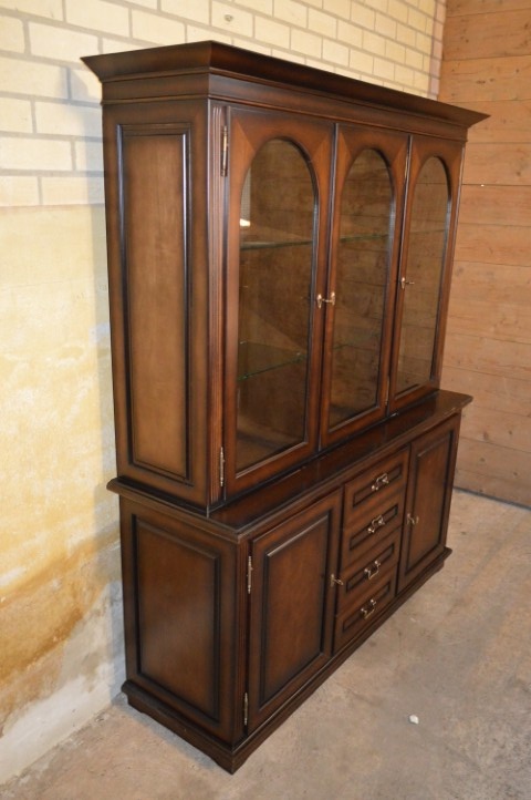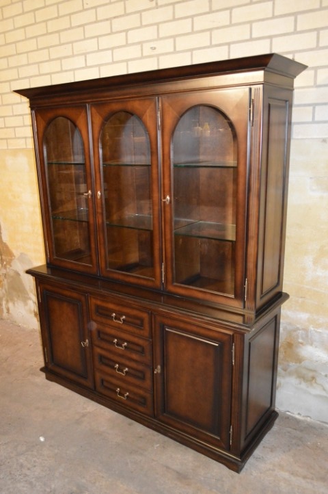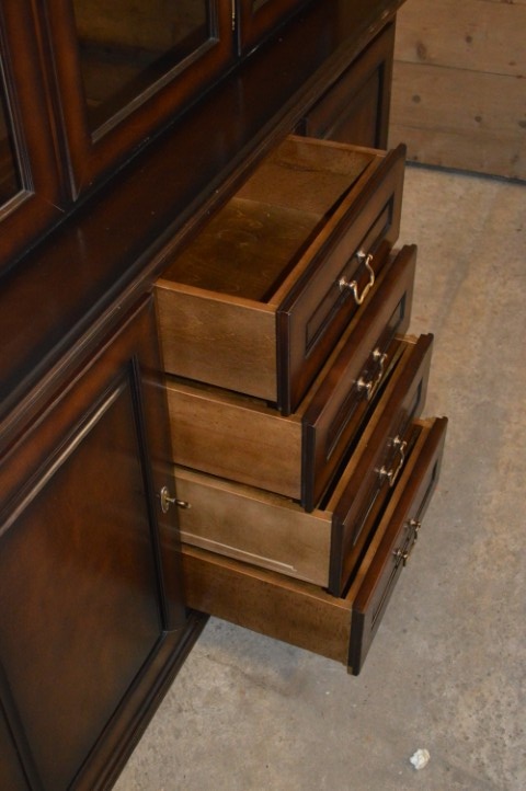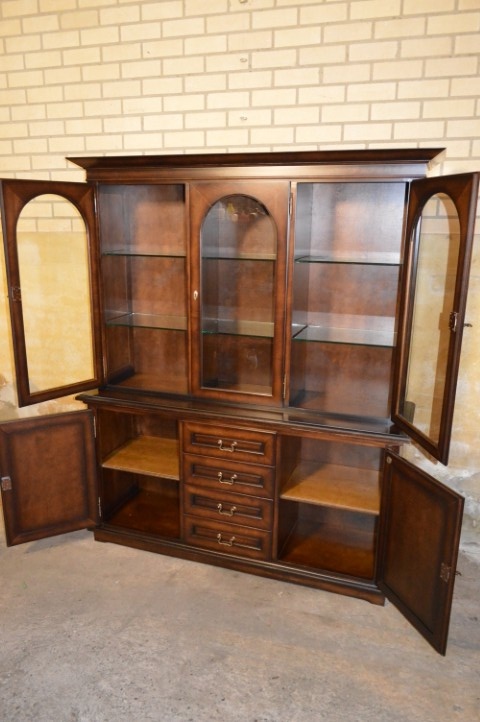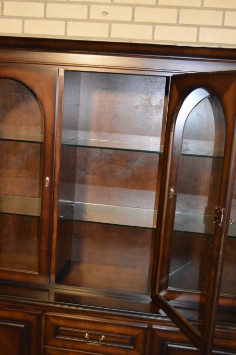 De bovenkast is voorzien van drie glasdeuren met fraaie ronde bogen. Achter het glas bevinden zich twee glazen legplanken, ideaal om glaswerk, servies of een mooie verzameling stijlvol te presenteren.De onderkast is praktisch ingedeeld met in het midden vier laden en aan beide zijkanten gesloten kastjes. Hierdoor biedt de kast niet alleen uitstraling, maar ook volop functionele bergruimte.