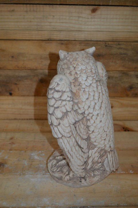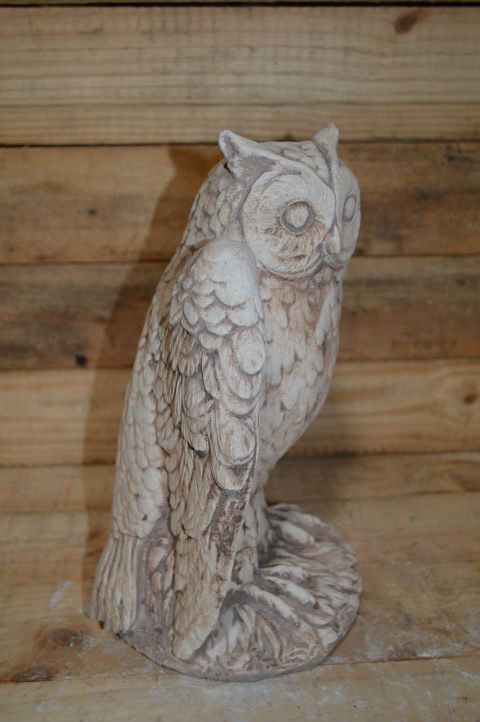 Een prachtig natuurgetrouw beeld dat direct de aandacht trekt. Het betonnen beeld oehoe uil staat op een boomstronk met stevige voet, zodat het altijd mooi rechtop blijft staan.