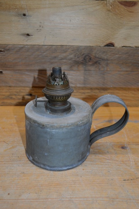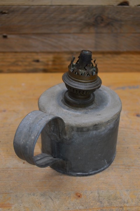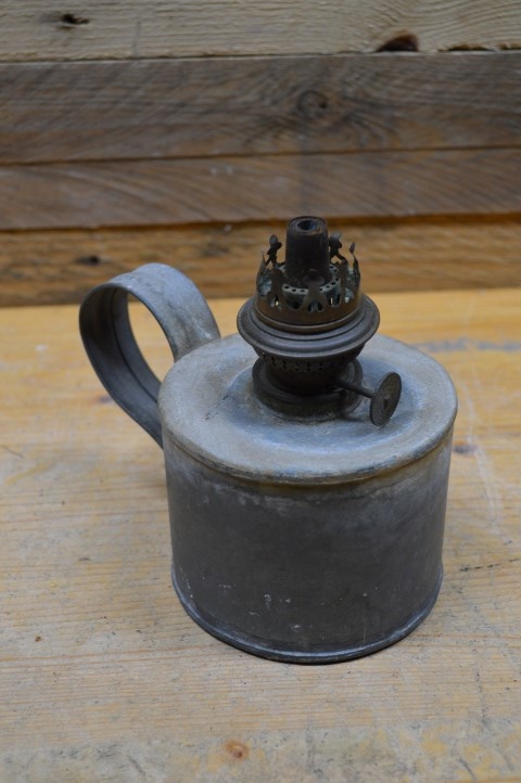 Zeldzame retro olielamp met zinken olie reservoir zonder lampenglas. Dit model olielampen werd gebruikt in boerderijen en fabrieken en hebben een ronde kouslont waardoor de helderheid van het licht veel groter is.