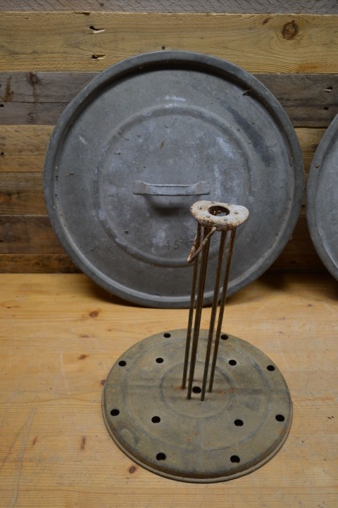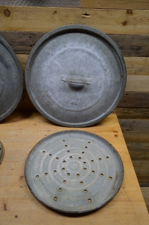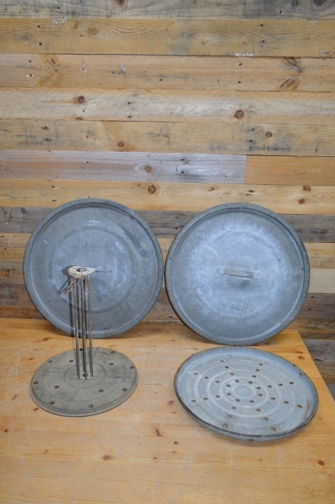Deze zinken pannenonderdelen zijn zeer geschikt als wanddecoratie, maar kunnen ook bijvoorbeeld gebruikt worden als een mooie fruitschaal of als onderzetter onder een schaal of plantenbak, de mogelijkheden zijn eindeloos. De onderdelen zijn eerder gebruikt dus ze hebben uiteraard al wel wat gebruikssporen maar ze verkeren verder nog in goede staat.