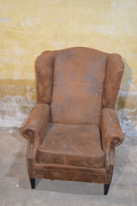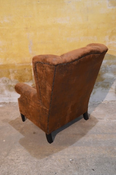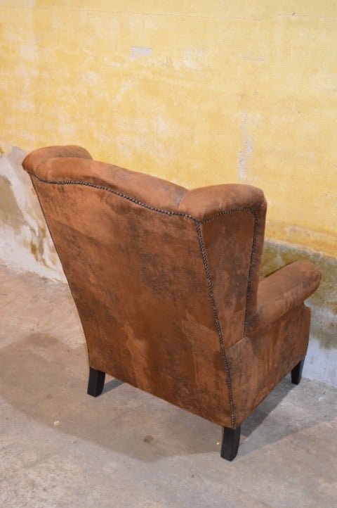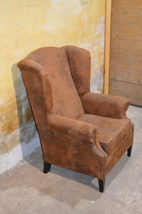 Deze oorfauteuil van nubuckleer is een prachtig voorbeeld van comfort en karakter uit de jaren 60. De fauteuil is uitgevoerd in een warme goudbruine kleur en voorzien van zacht geruwd nubuckleer dat door de jaren heen een mooie sleetse, Engels gepatineerde uitstraling heeft gekregen.