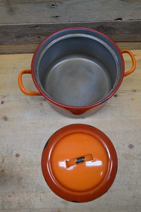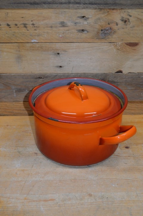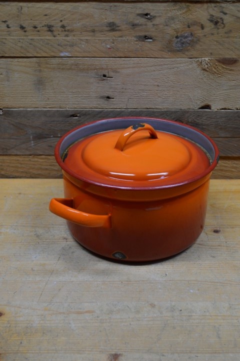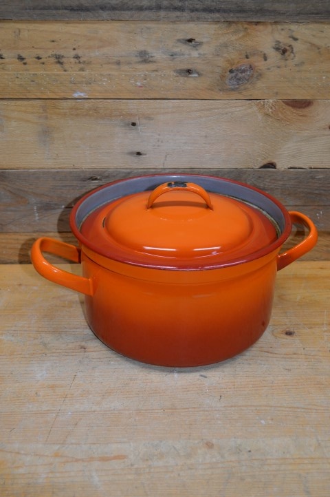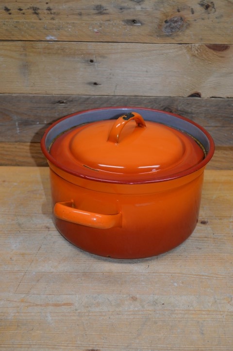 Oranje emaille pan in 2 kleurtonen met een grijze binnenkant en met de originele deksel. Erg leuk om te gebruiken als decoratie of voor de verzamelaar. Door de jaren heen heeft deze pan wel gebruikssporen opgelopen maar hierdoor krijgt de braadpan ook een mooi geleefd karakter.