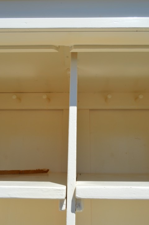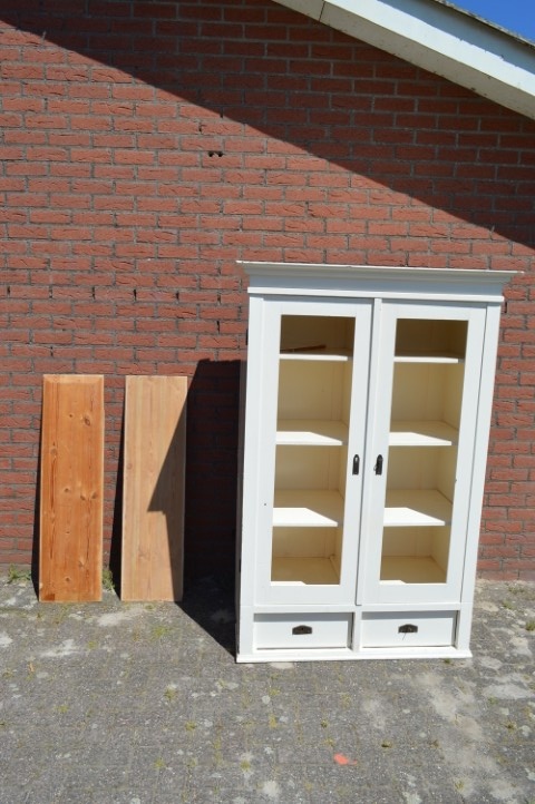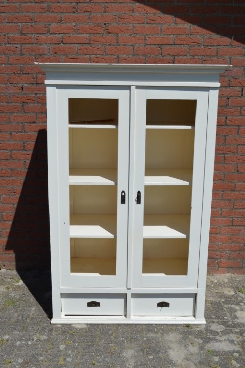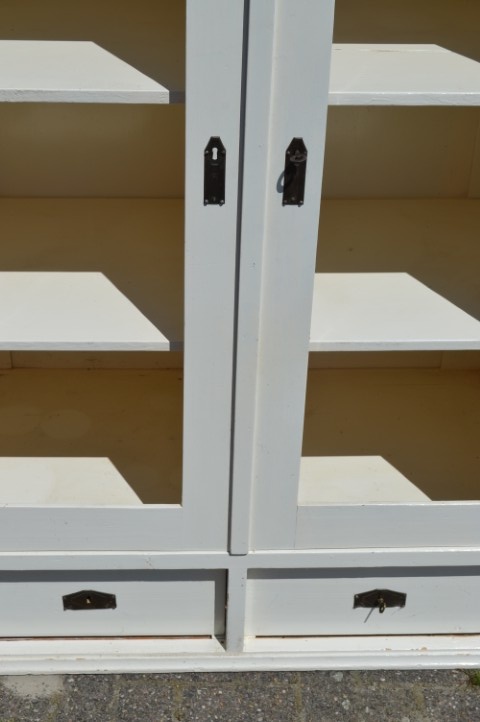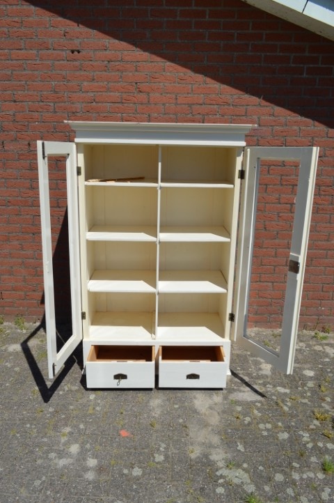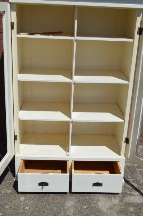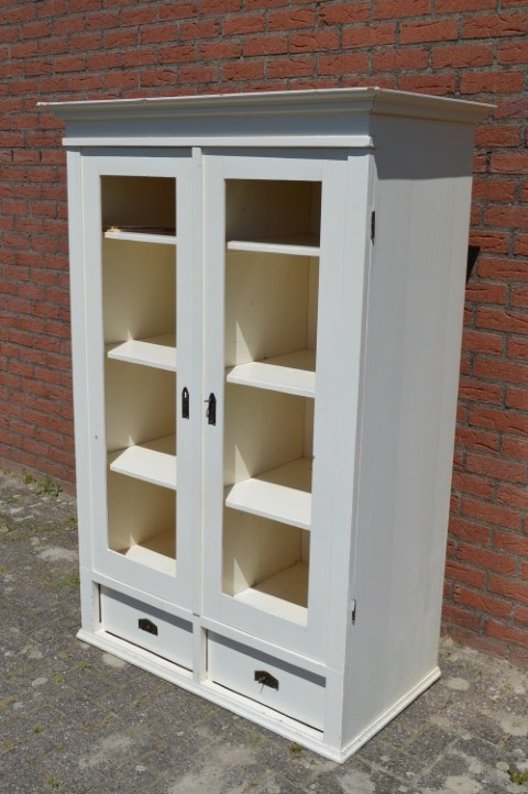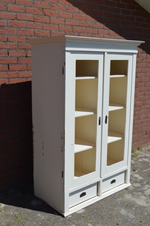 Deze brocante vitrinekast of kledingkast is gemaakt van grenenhout en wit geschilderd. De kast heeft twee afsluitbare deuren met panelen. Maakt u in plaats van de panelen glas in de deuren dan hebt u een prachtige vitrinekast. Binnenin zijn drie nieuwe planken gemaakt. Onder de deuren zitten twee mooie diepe laden. De kast bestaat uit één geheel.