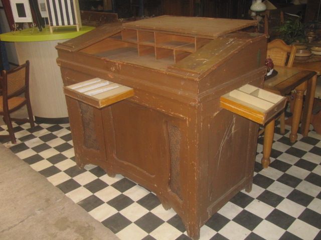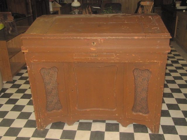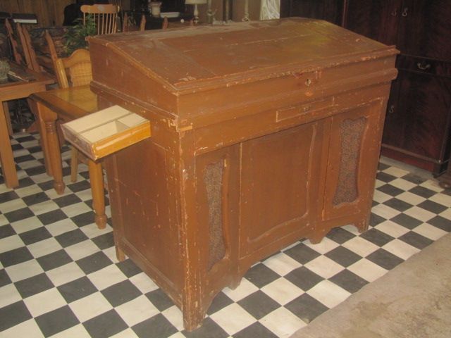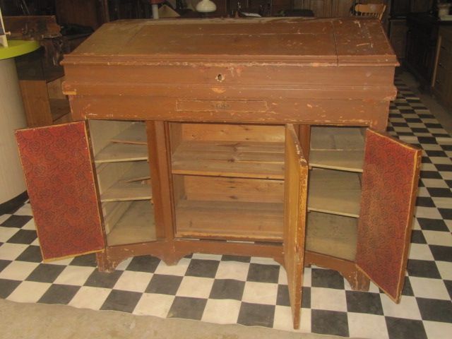 Dit antiek sta-bureau van grenenhout is niet zomaar een toonbank: het is een fraai voorbeeld van de voorlopers van ergonomische werkplekken in de vroege 20e eeuw. Onderin bevinden zich drie kastjes met deuren, waarvan twee met een stoffen bekleding. Daarnaast zijn er diverse laden – één in het midden en extra lades aan beide zijkanten – en een klep bovenin de lessenaar die extra bergruimte en schapjes biedt.