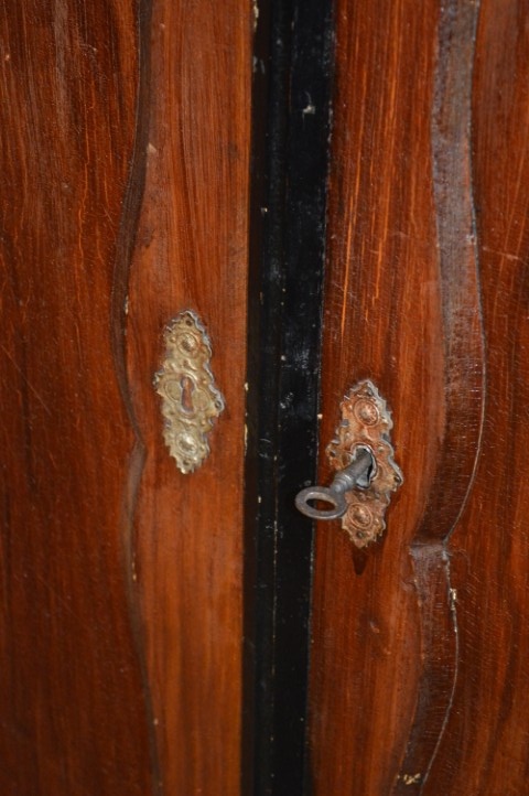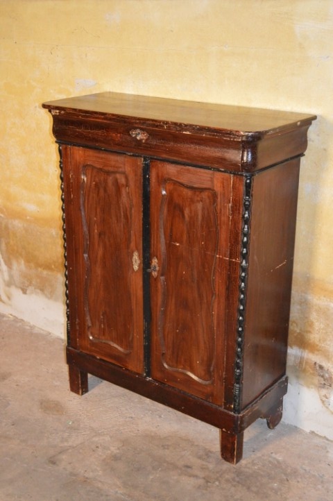 Charmant oud Hollands meidenkastje met paneeldeuren en lade. Dit degelijke houten kastje uit de boerenstijl heeft twee fraaie paneeldeuren met stijlvolle sleutelplaatjes en staat op hoge poten. Boven de deuren bevindt zich een praktische lade. Door het compacte formaat is dit kastje niet alleen decoratief, maar ook geschikt als wandkastje of penantkastje waarop nog iets geplaatst kan worden. De zichtbare gebruikssporen geven het meubel extra karakter en een authentieke uitstraling. Een sfeervolle en praktische toevoeging aan elk interieur met een landelijke of vintage sfeer.